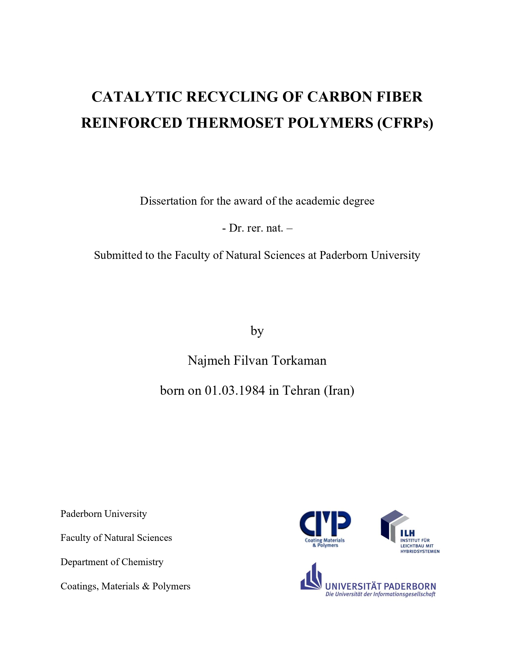 Catalytic recycling of carbon fiber reinforced thermost polymers (CFRPs) / by Najmeh Filvan Torkaman ; Reviewers: Prof. Dr. Wolfgang Bremser, Prof. Dr. Rene Wilhelm, AOR. Dr. Ilona Horwath