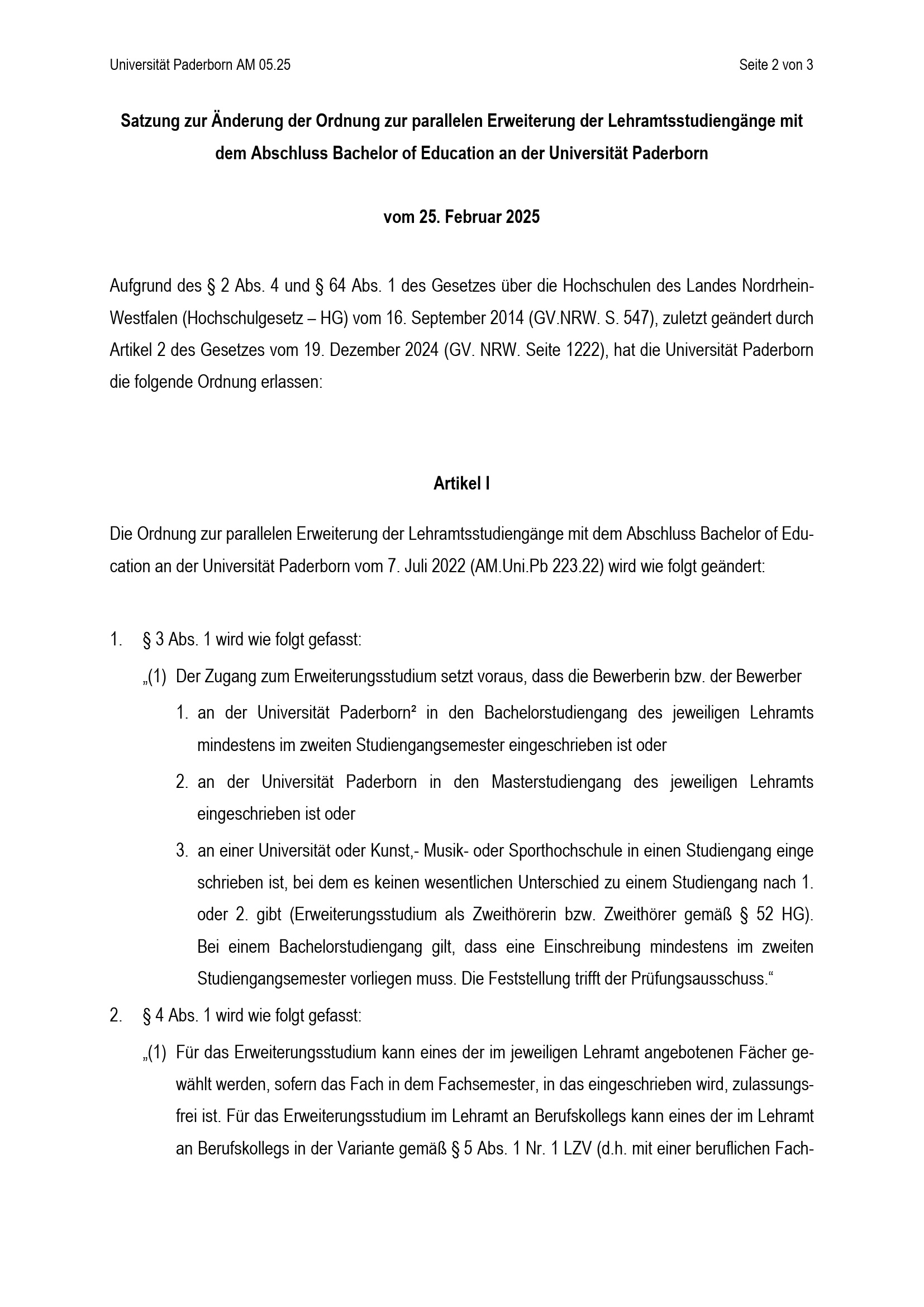 Satzung zur Änderung der Ordnung zur parallelen Erweiterung der Lehramtsstudiengänge mit dem Abschluss Bachelor of Education an der Universität Paderborn : vom 25. Februar 2025