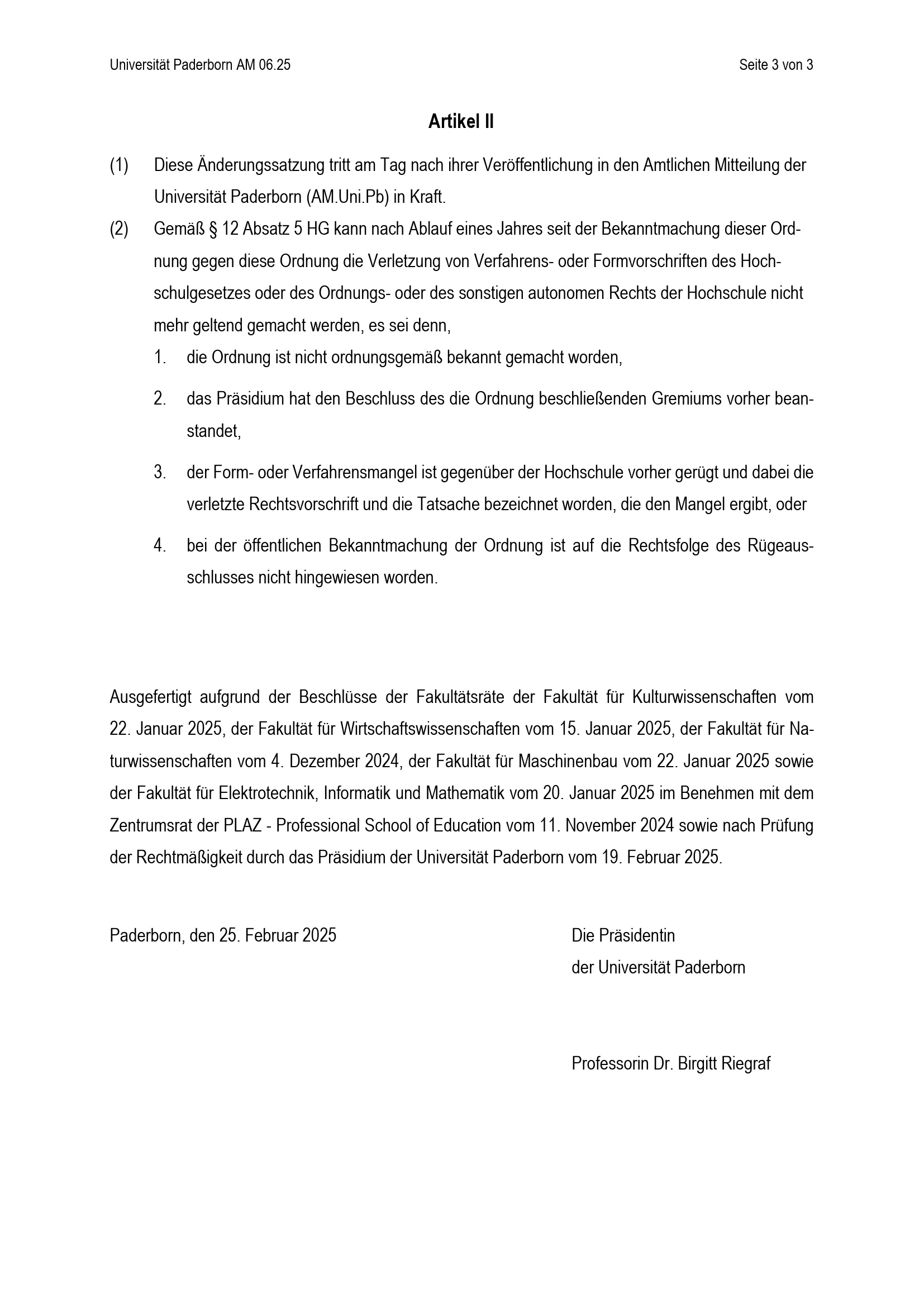 Satzung zur Änderung der Ordnung zur parallelen Erweiterung der Lehramtsstudiengänge mit dem Abschluss Master of Education an der Universität Paderborn : vom 25. Februar 2025