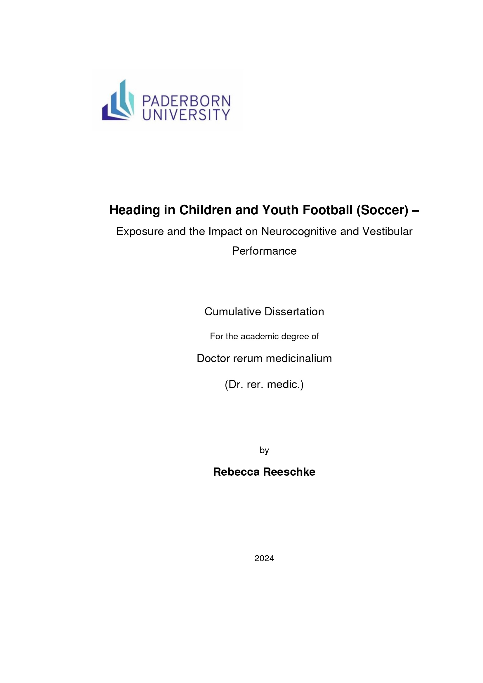 Heading in children and youth football (soccer) : exposure and the impact on neurocognitive and vestibular performance / by Rebecca Reeschke ; [Principal supervisor: Prof. Dr. Dr. Claus Reinsberger]
