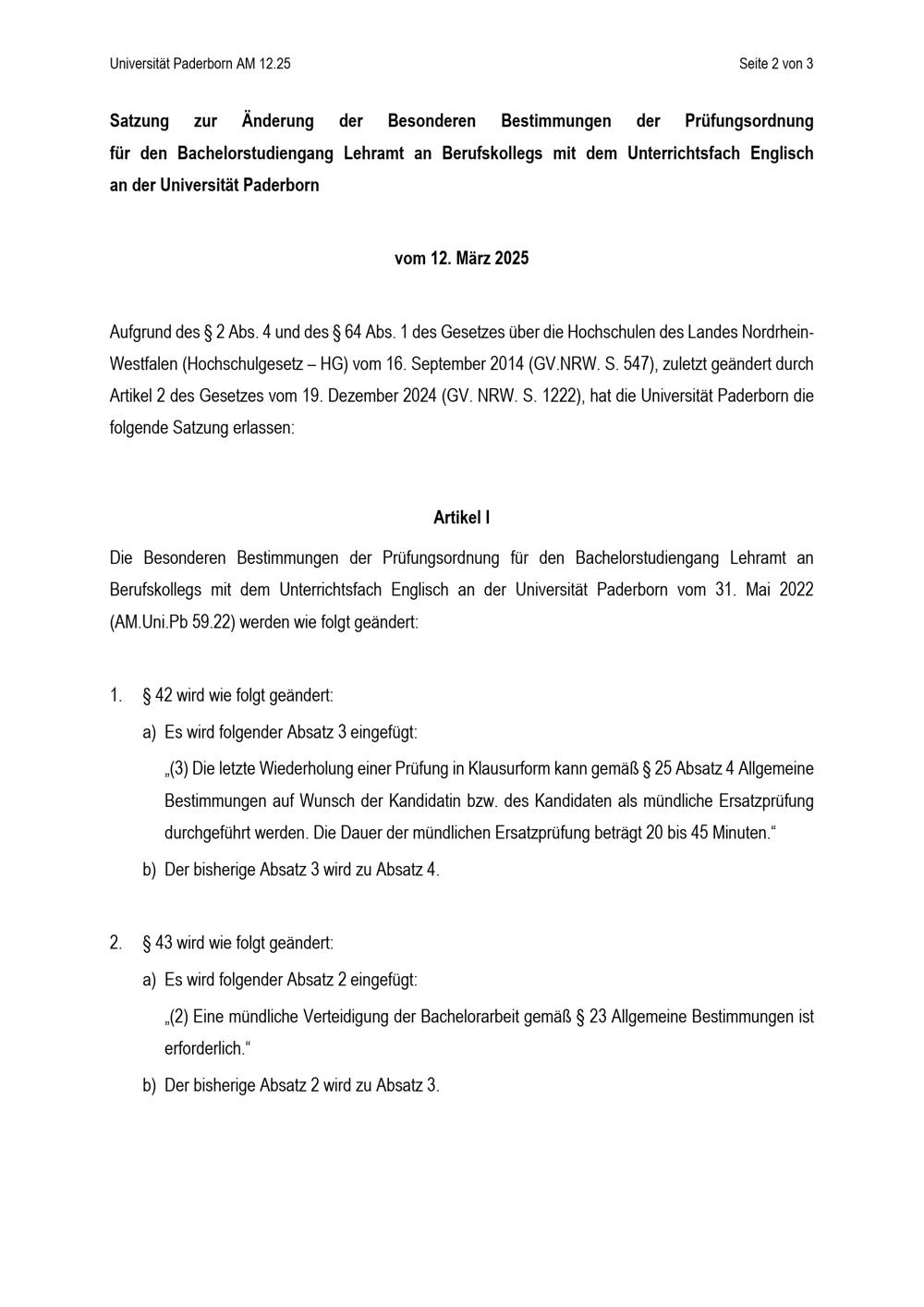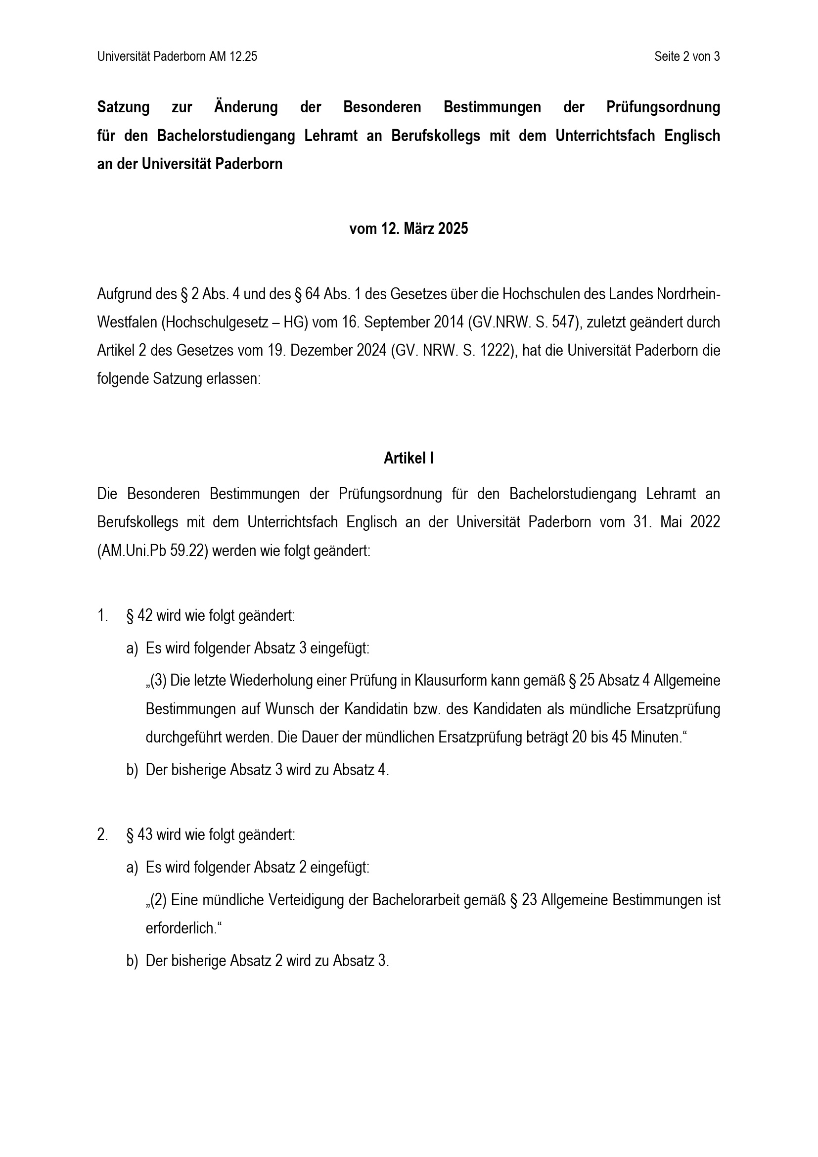 Satzung zur Änderung der Besonderen Bestimmungen der Prüfungsordnung für den Bachelorstudiengang Lehramt an Berufskollegs mit dem Unterrichtsfach Englisch an der Universität Paderborn : vom 12. März 2025