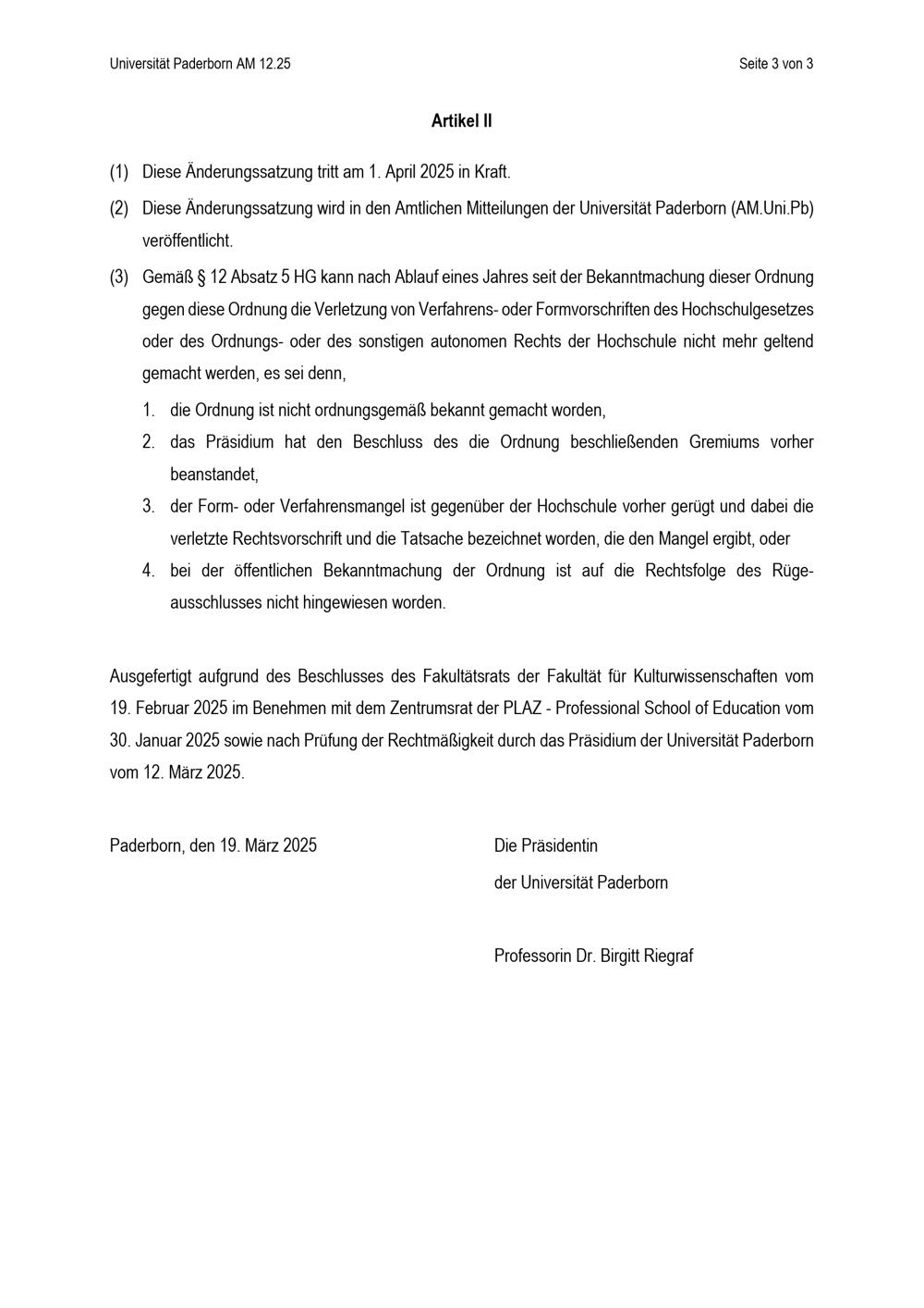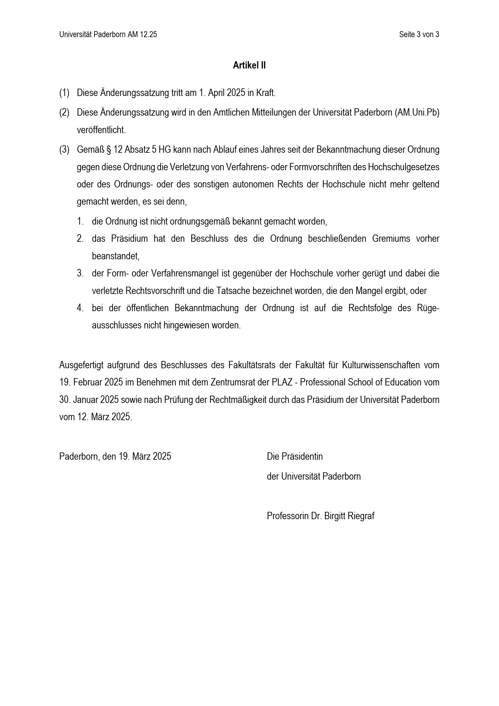 Satzung zur Änderung der Besonderen Bestimmungen der Prüfungsordnung für den Bachelorstudiengang Lehramt an Berufskollegs mit dem Unterrichtsfach Englisch an der Universität Paderborn : vom 12. März 2025