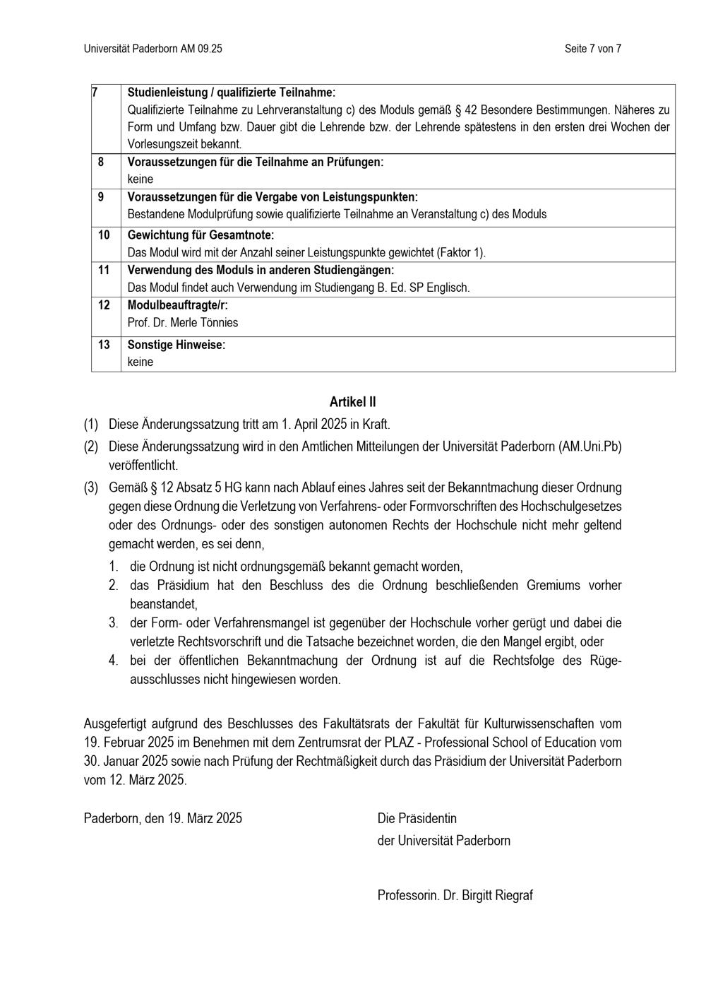 Satzung zur Änderung der Besonderen Bestimmungen der Prüfungsordnung für den Bachelorstudiengang Lehramt an Grundschulen mit dem Unterrichtsfach Englisch an der Universität Paderborn : vom 19. März 2025