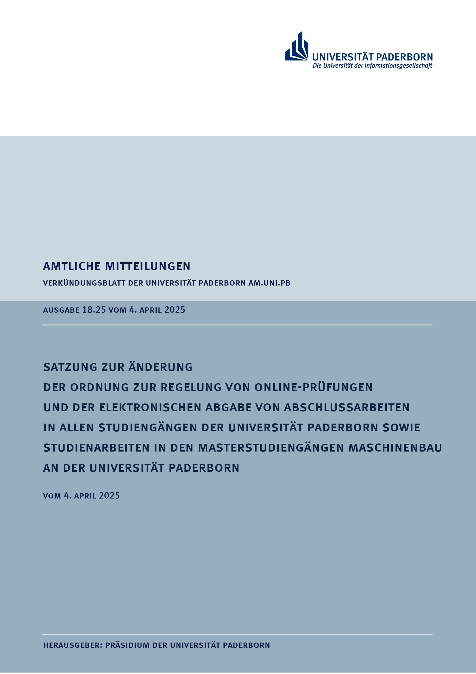 Satzung zur Änderung der Ordnung zur Regelung von Online-Prüfungen und der elektronischen Abgabe von Abschlussarbeiten in allen Studiengängen der Universität Paderborn sowie Studienarbeiten in den Masterstudiengängen Maschinenbau an der Universität Paderborn : vom 4. April 2025