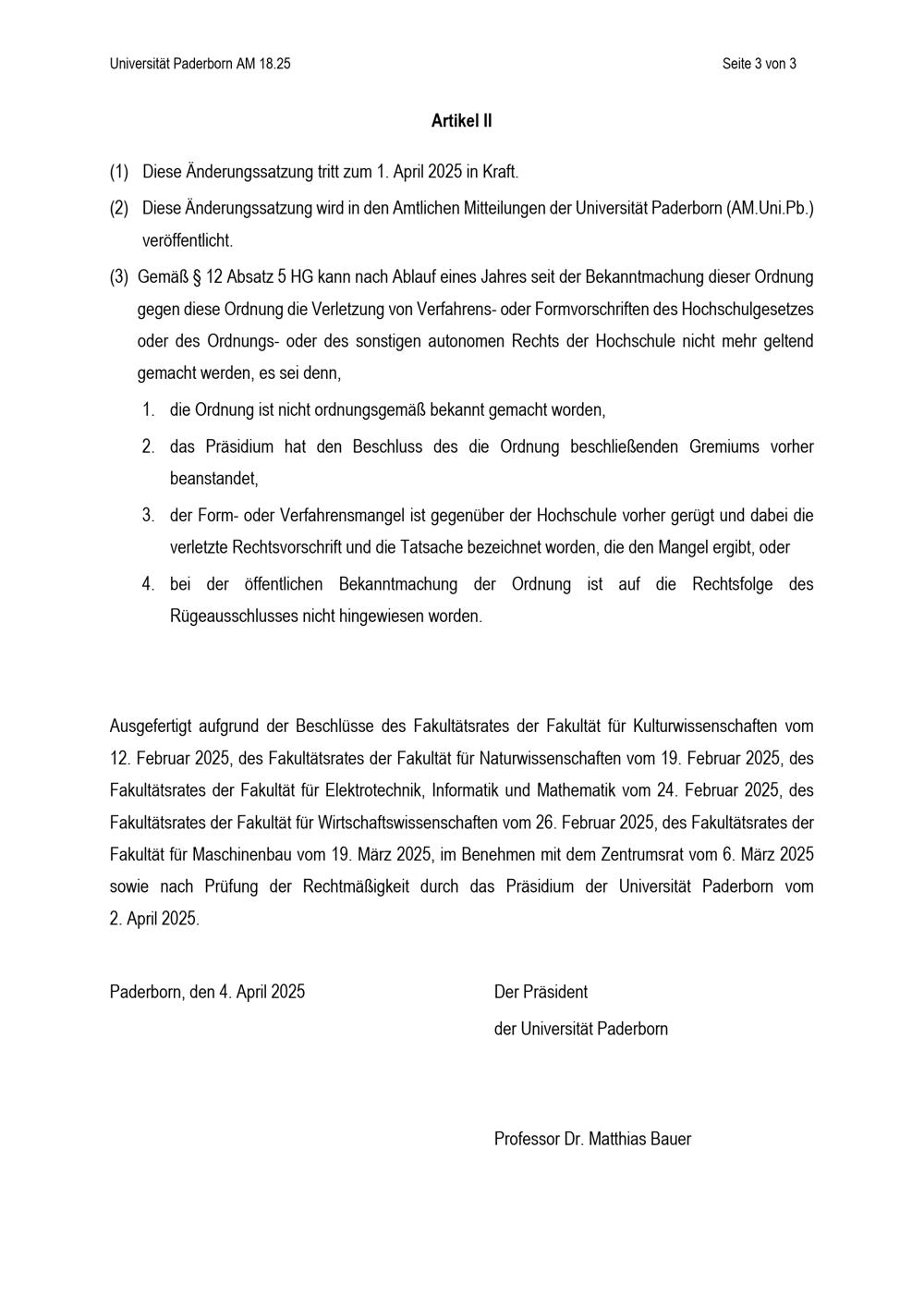 Satzung zur Änderung der Ordnung zur Regelung von Online-Prüfungen und der elektronischen Abgabe von Abschlussarbeiten in allen Studiengängen der Universität Paderborn sowie Studienarbeiten in den Masterstudiengängen Maschinenbau an der Universität Paderborn : vom 4. April 2025