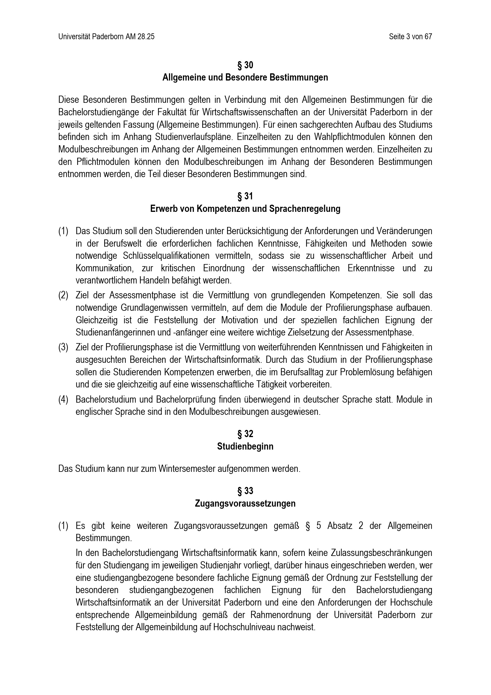 Besondere Bestimmungen der Prüfungsordnung für den Bachelorstudiengang Wirtschaftsinformatik der Fakultät für Wirtschaftswissenschaften an der Universität Paderborn : vom 25. April 2025