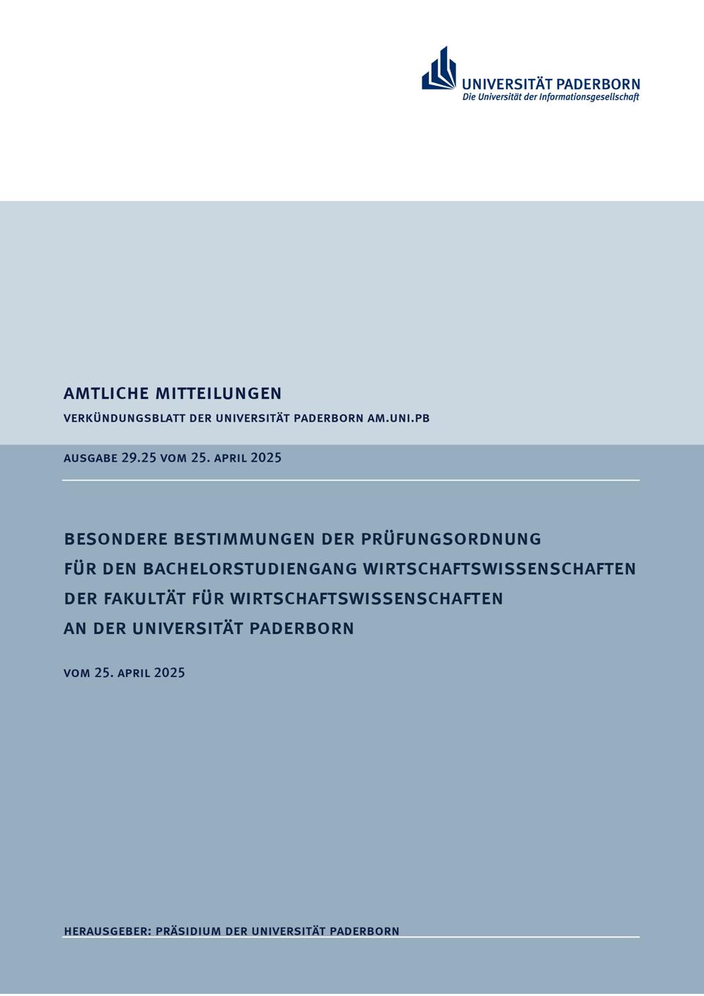 Besondere Bestimmungen der Prüfungsordnung für den Bachelorstudiengang Wirtschaftswissenschaften der Fakultät für Wirtschaftswissenschaften an der Universität Paderborn : vom 25. April 2025