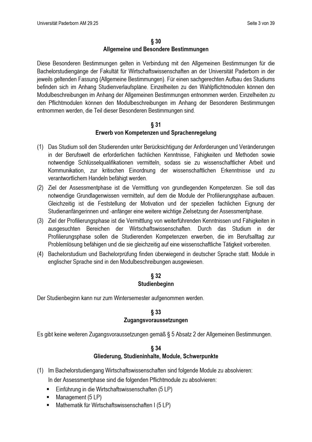 Besondere Bestimmungen der Prüfungsordnung für den Bachelorstudiengang Wirtschaftswissenschaften der Fakultät für Wirtschaftswissenschaften an der Universität Paderborn : vom 25. April 2025