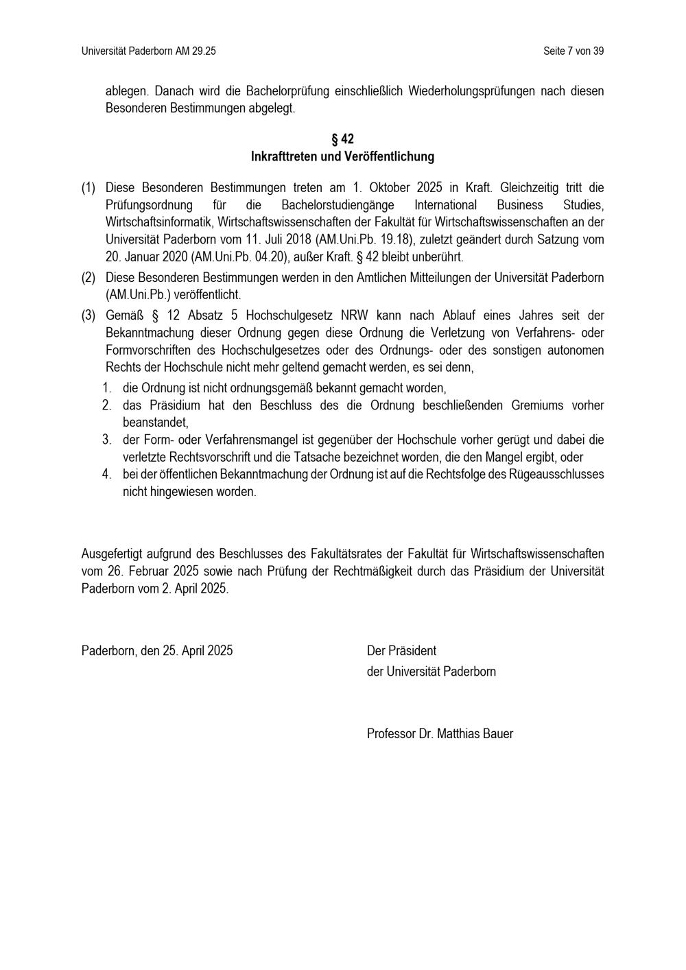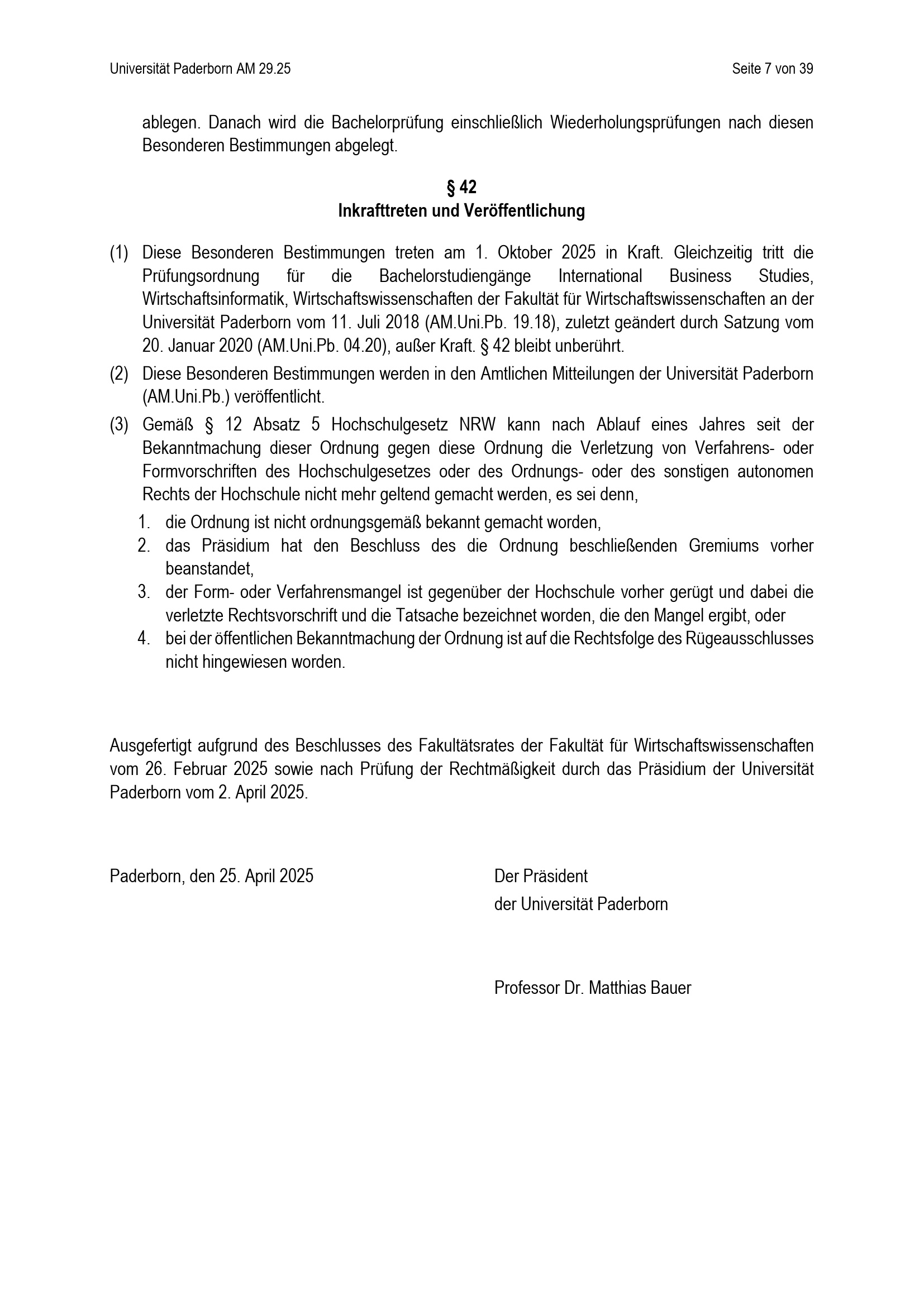 Besondere Bestimmungen der Prüfungsordnung für den Bachelorstudiengang Wirtschaftswissenschaften der Fakultät für Wirtschaftswissenschaften an der Universität Paderborn : vom 25. April 2025