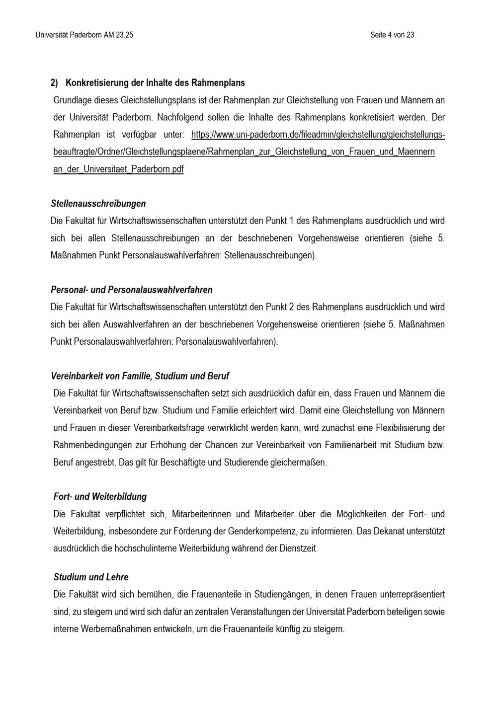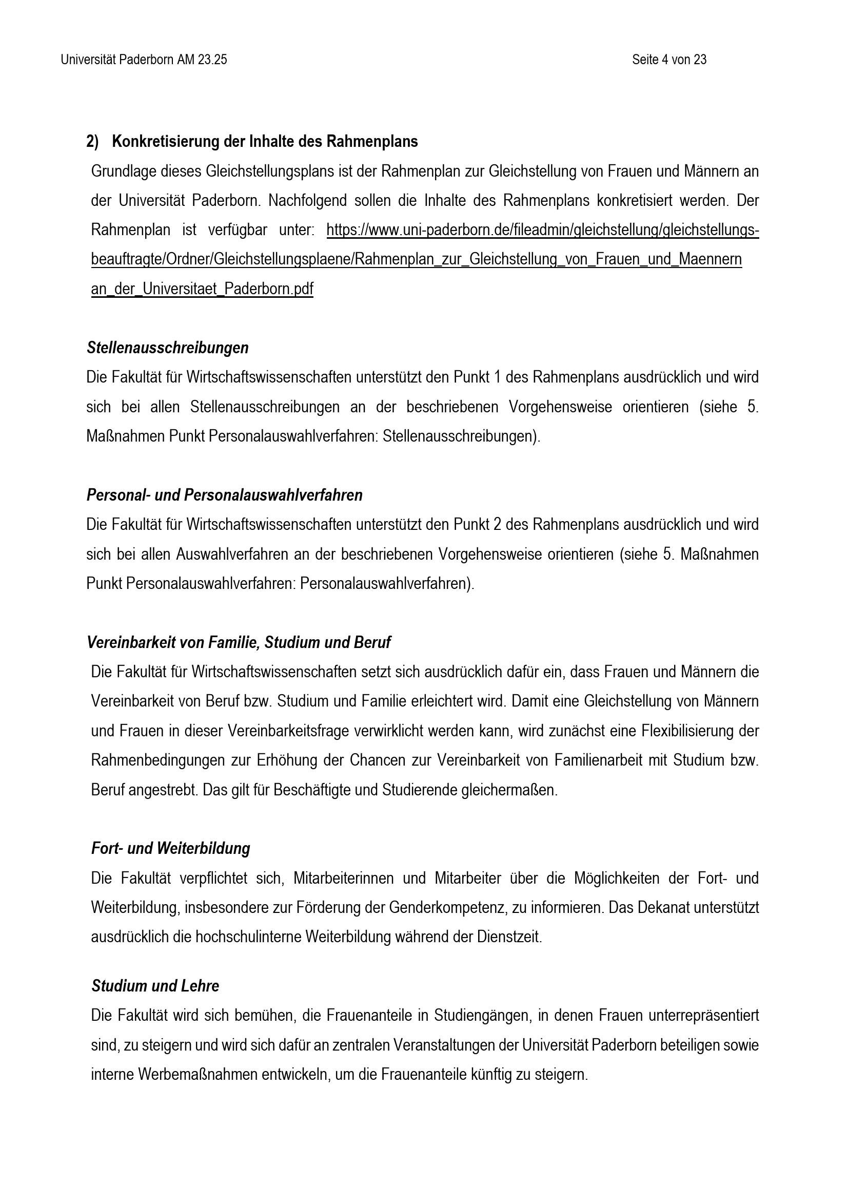 Gleichstellungsplan der Fakultät für Wirtschaftswissenschaften zur Gleichstellung von Frauen und Männern an der Universität Paderborn : vom 25. April 2025