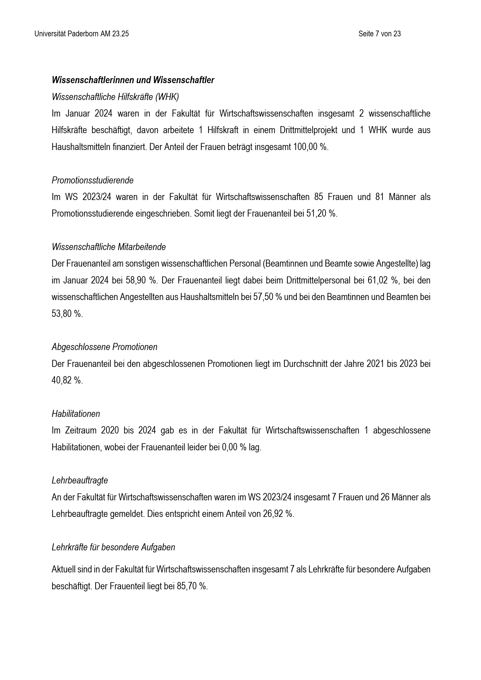 Gleichstellungsplan der Fakultät für Wirtschaftswissenschaften zur Gleichstellung von Frauen und Männern an der Universität Paderborn : vom 25. April 2025