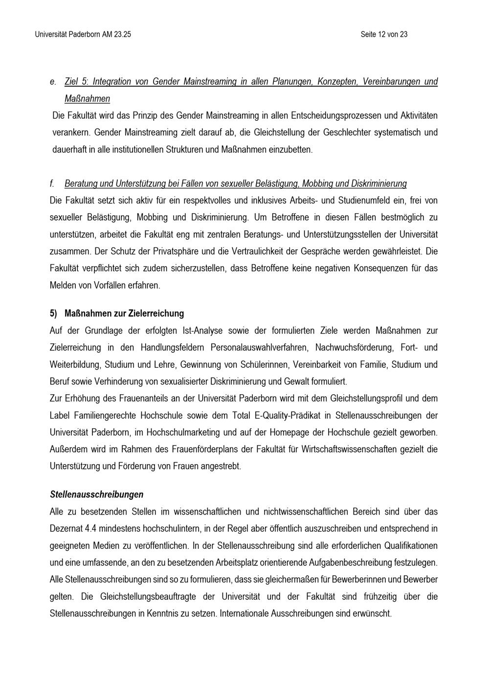 Gleichstellungsplan der Fakultät für Wirtschaftswissenschaften zur Gleichstellung von Frauen und Männern an der Universität Paderborn : vom 25. April 2025