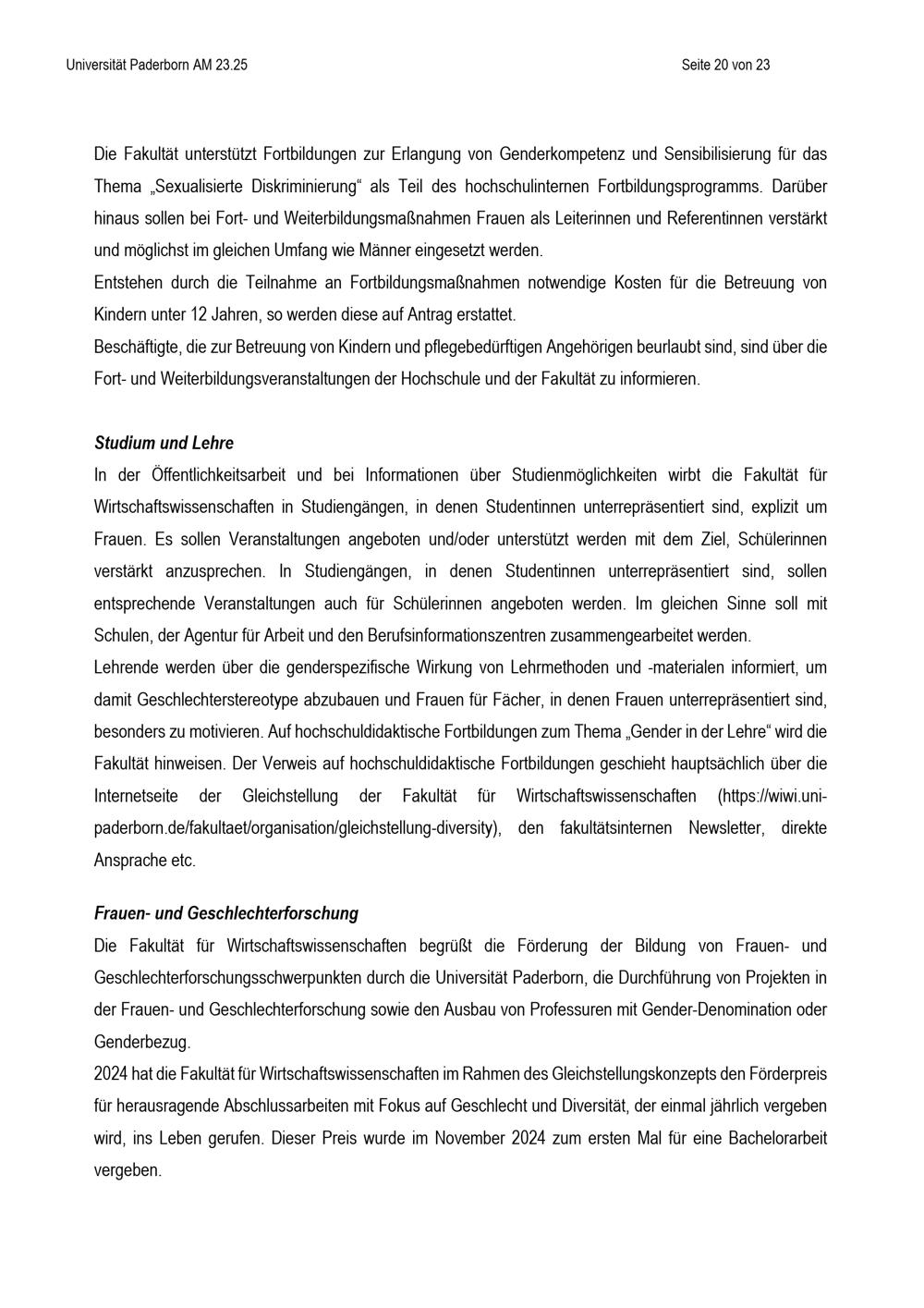 Gleichstellungsplan der Fakultät für Wirtschaftswissenschaften zur Gleichstellung von Frauen und Männern an der Universität Paderborn : vom 25. April 2025