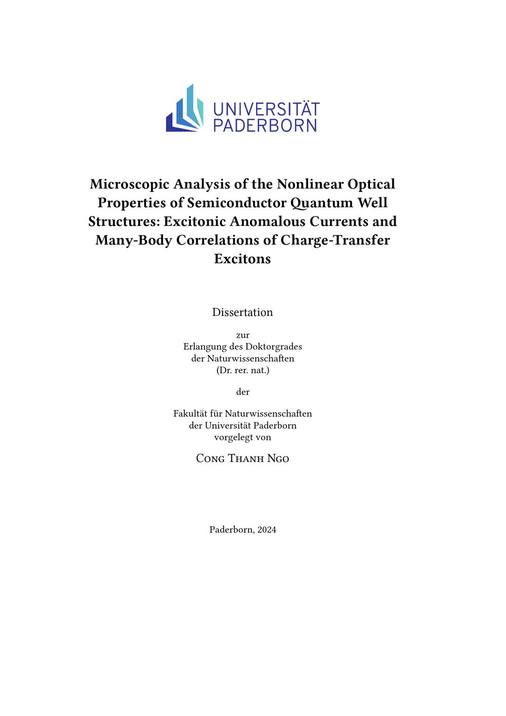 Microscopic Analysis of the Nonlinear Optical Properties of Semiconductor Quantum Well Structures: Excitonic Anomalous Currents and Many-Body Correlations of Charge-Transfer Excitons / Cong Thanh Ngo ; Erstgutachter: Prof. Dr. Torsten Meier, Zweitgutachter: Dr. Xuekai Ma