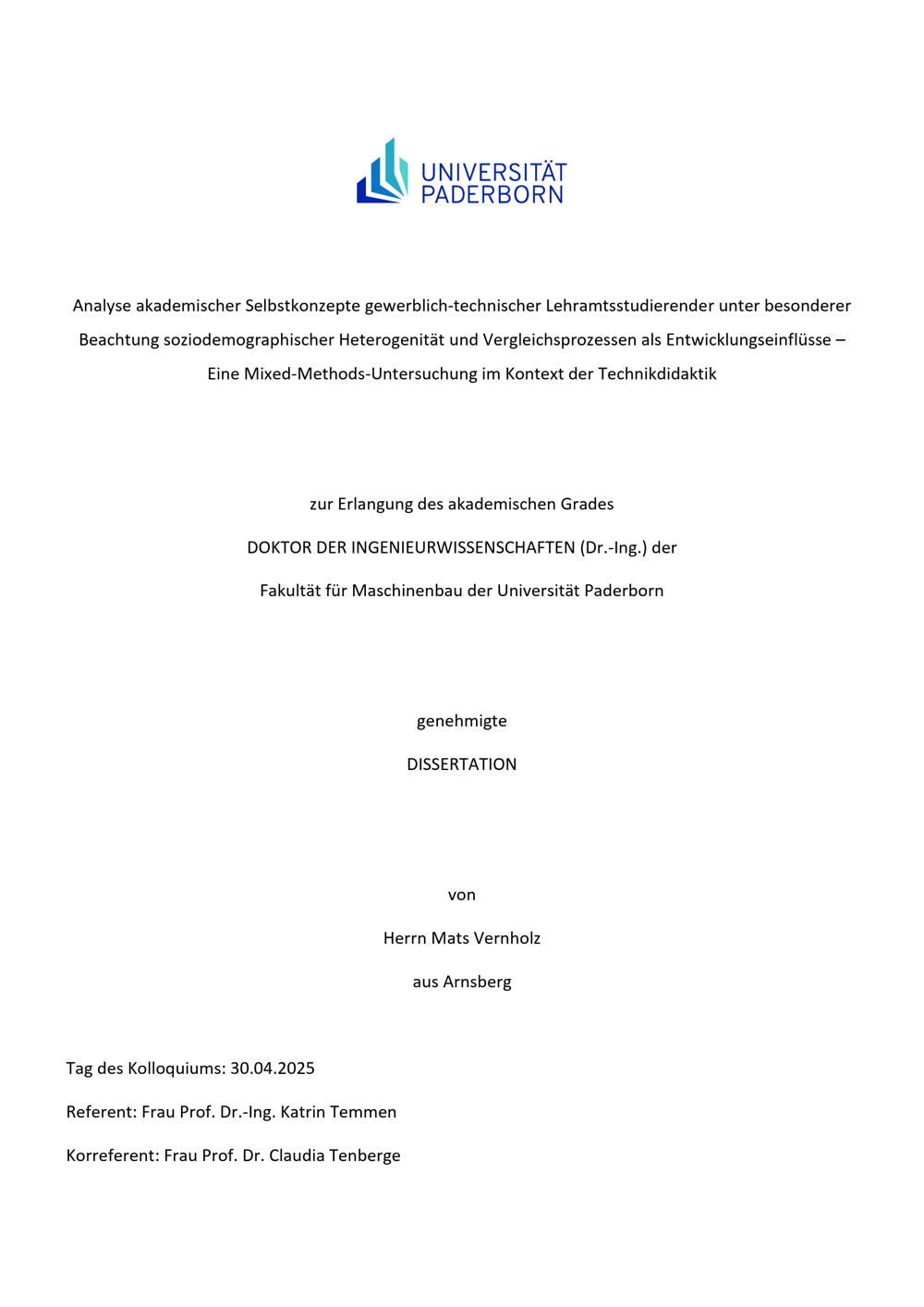 Analyse akademischer Selbstkonzepte gewerblich-technischer Lehramtsstudierender unter besonderer Beachtung soziodemographischer Heterogenität und Vergleichsprozessen als Entwicklungseinflüsse : eine Mixed-Methods-Untersuchung im Kontext der Technikdidaktik / von Mats Vernholz ; Referent: Frau Prof. Dr.-Ing. Katrin Temmen, Korreferent: Frau Prof. Dr. Claudia Tenberge