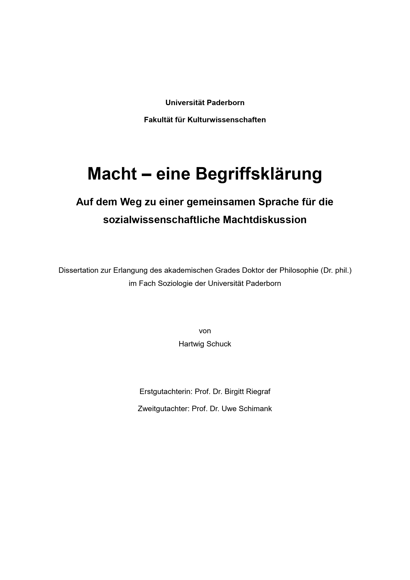 Macht – eine Begriffsklärung : auf dem Weg zu einer gemeinsamen Sprache für die sozialwissenschaftliche Machtdiskussion / Hartwig Schuck ; Erstgutachterin: Prof. Dr. Birgitt Riegraf, Zweitgutachter: Prof. Dr. Uwe Schimank