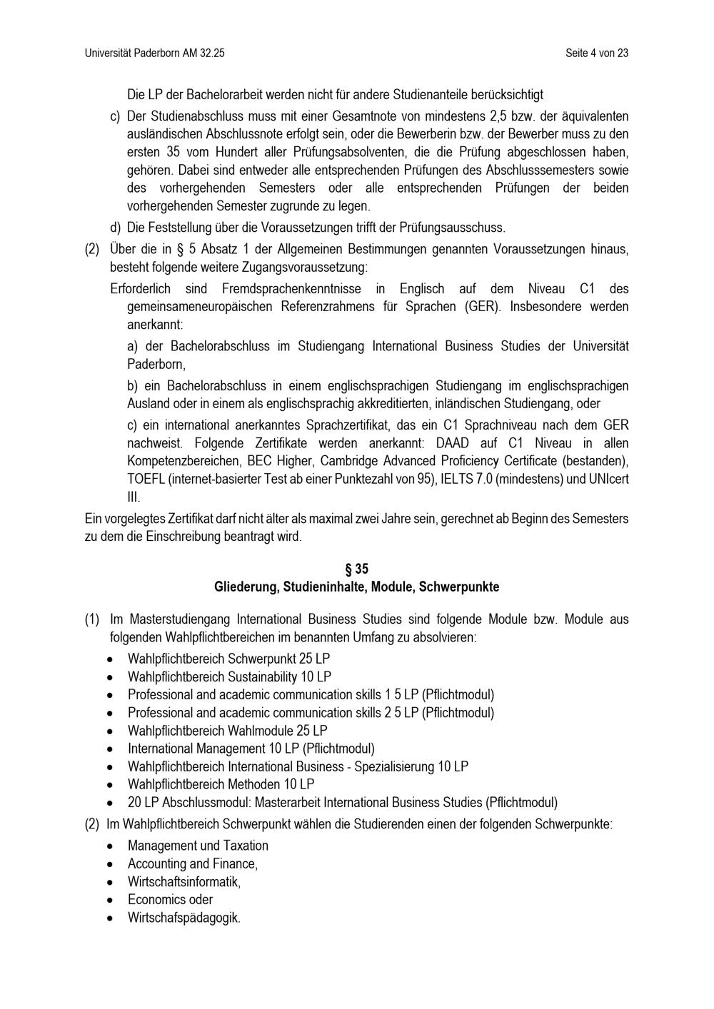 Besondere Bestimmungen der Prüfungsordnung für den Masterstudiengang International Business Studies der Fakultät für Wirtschaftswissenschaften an der Universität Paderborn : vom 20. Mai 2025
