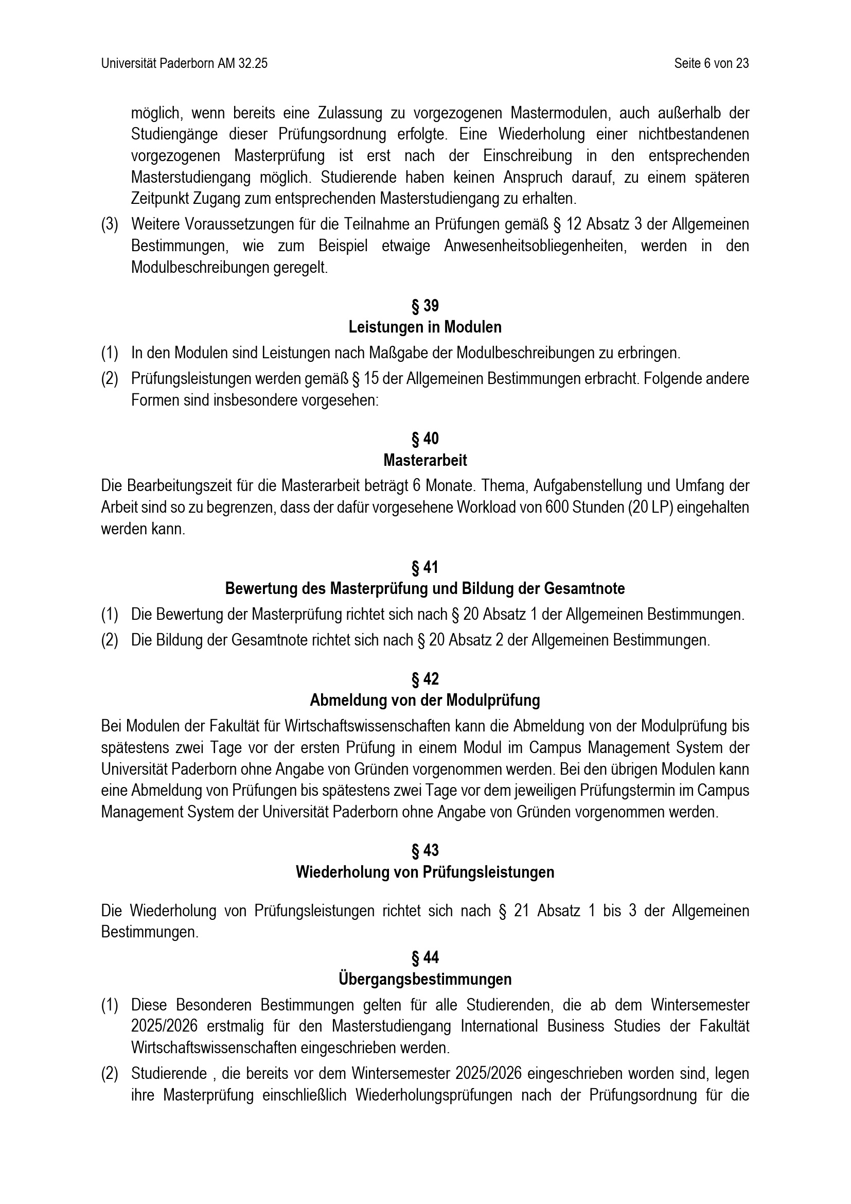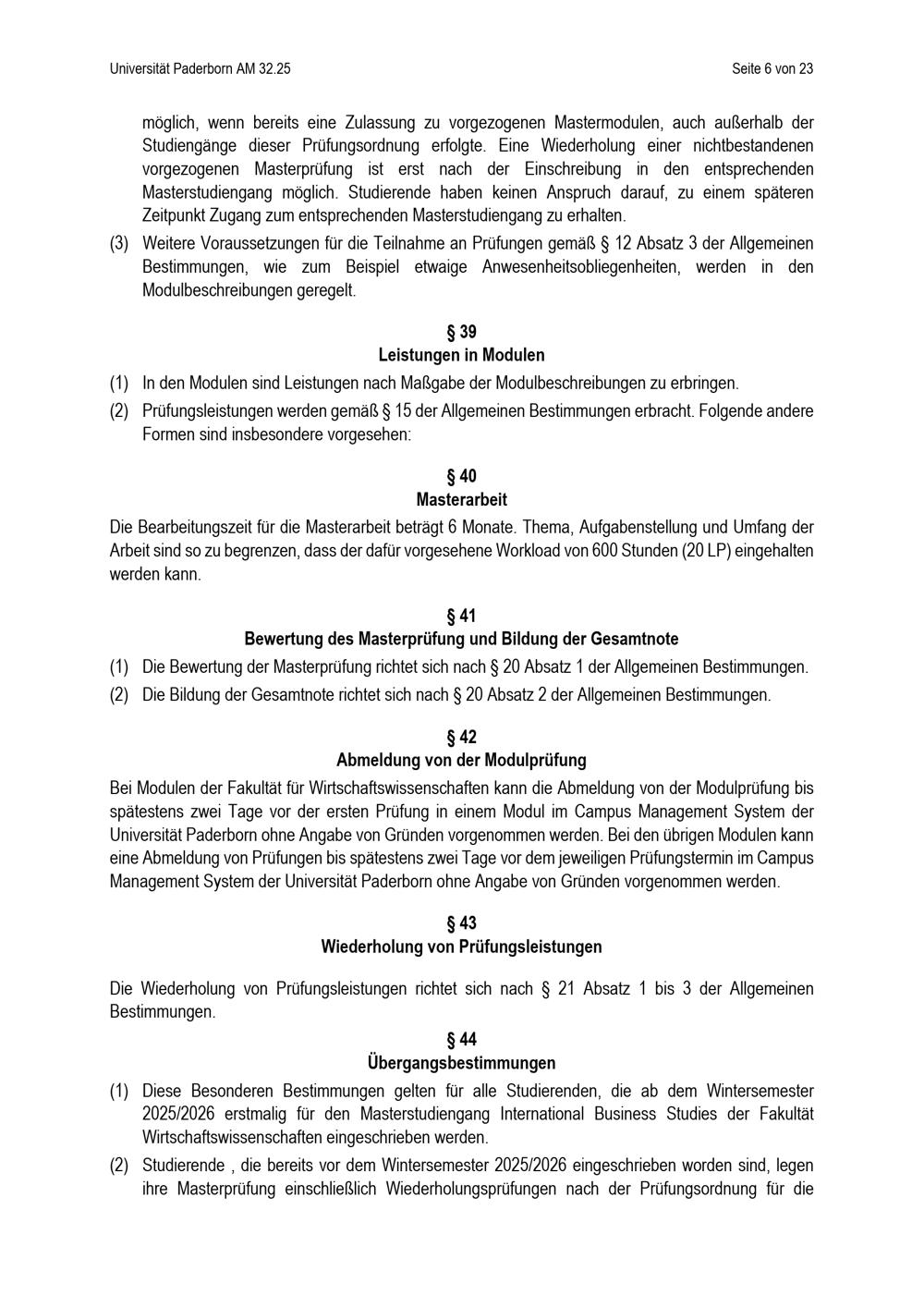 Besondere Bestimmungen der Prüfungsordnung für den Masterstudiengang International Business Studies der Fakultät für Wirtschaftswissenschaften an der Universität Paderborn : vom 20. Mai 2025