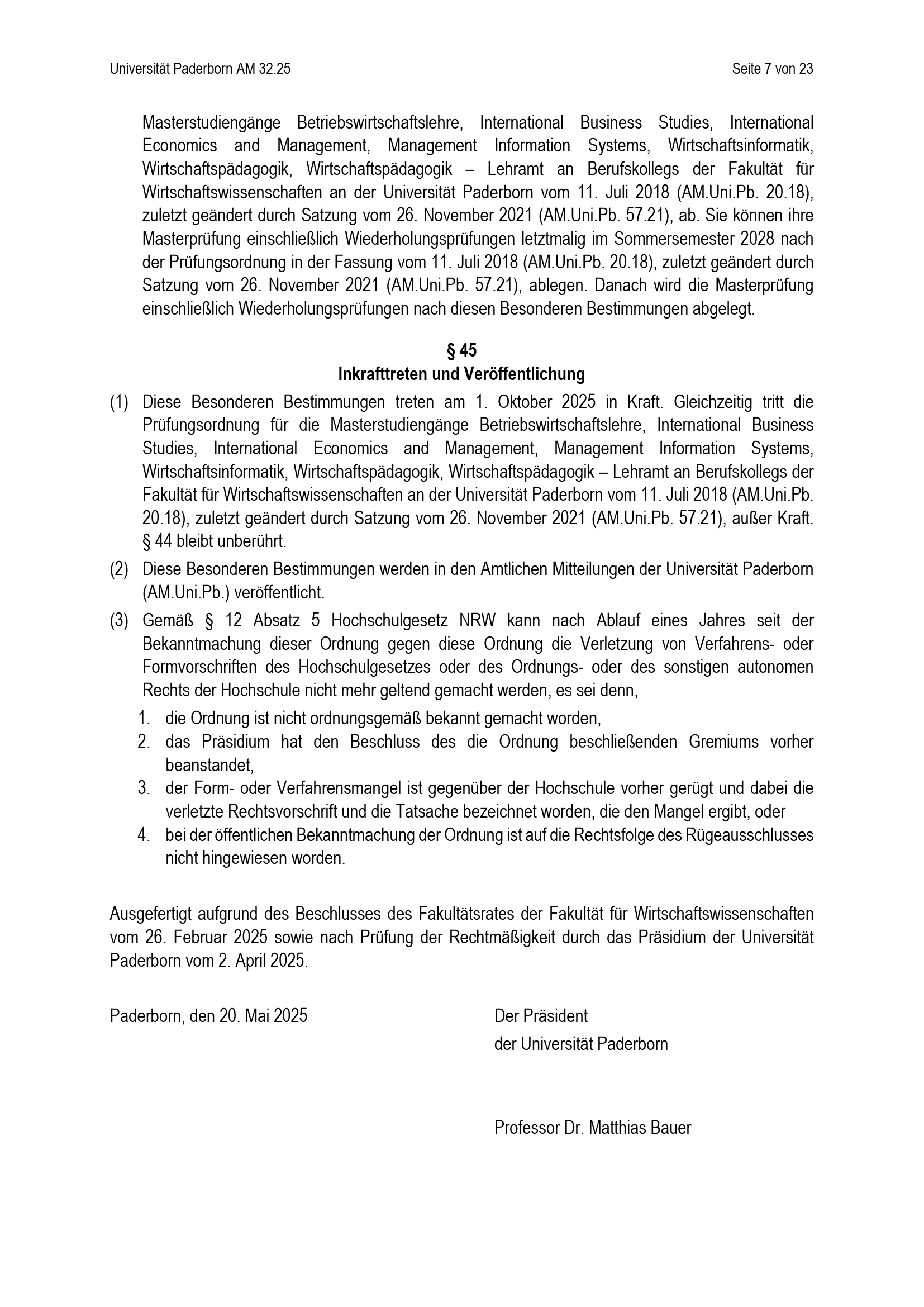 Besondere Bestimmungen der Prüfungsordnung für den Masterstudiengang International Business Studies der Fakultät für Wirtschaftswissenschaften an der Universität Paderborn : vom 20. Mai 2025