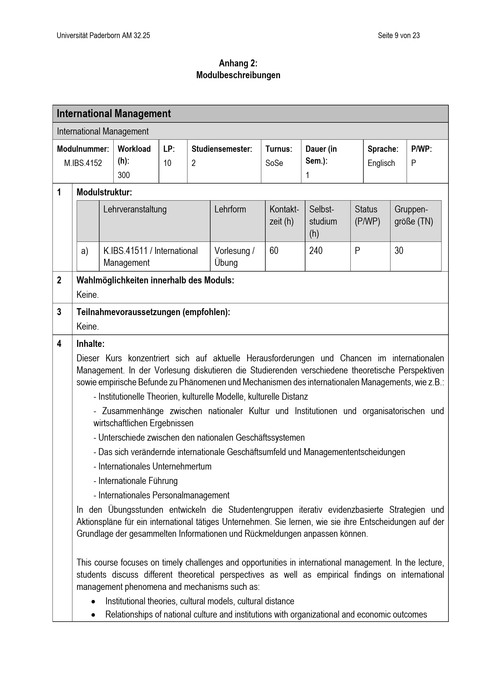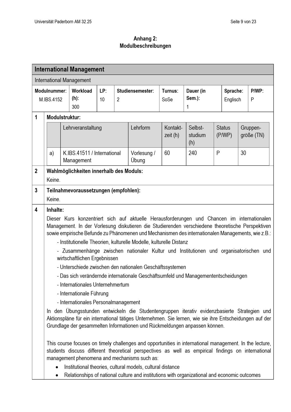 Besondere Bestimmungen der Prüfungsordnung für den Masterstudiengang International Business Studies der Fakultät für Wirtschaftswissenschaften an der Universität Paderborn : vom 20. Mai 2025