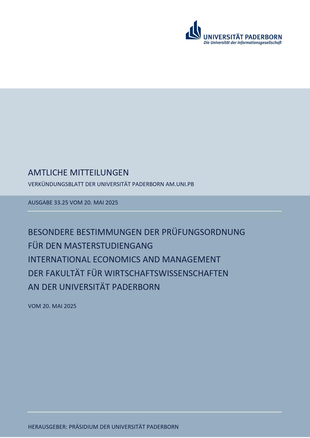 Besondere Bestimmungen der Prüfungsordnung für den Masterstudiengang International Economics and Management der Fakultät für Wirtschaftswissenschaften an der Universität Paderborn : vom 20. Mai 2025