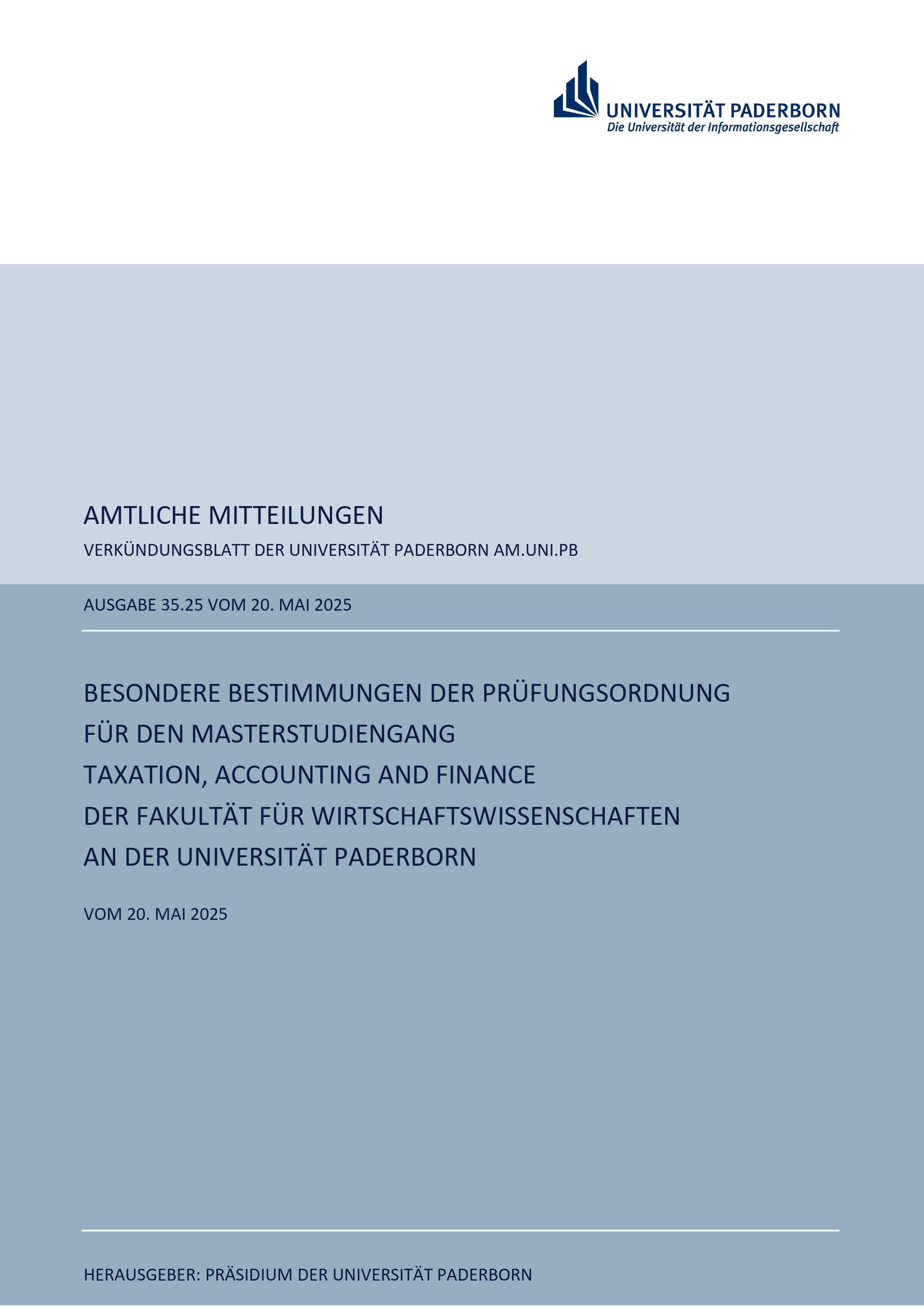 Besondere Bestimmungen der Prüfungsordnung für den Masterstudiengang Taxation, Accounting and Finance der Fakultät für Wirtschaftswissenschaften an der Universität Paderborn : vom 20. Mai 2025