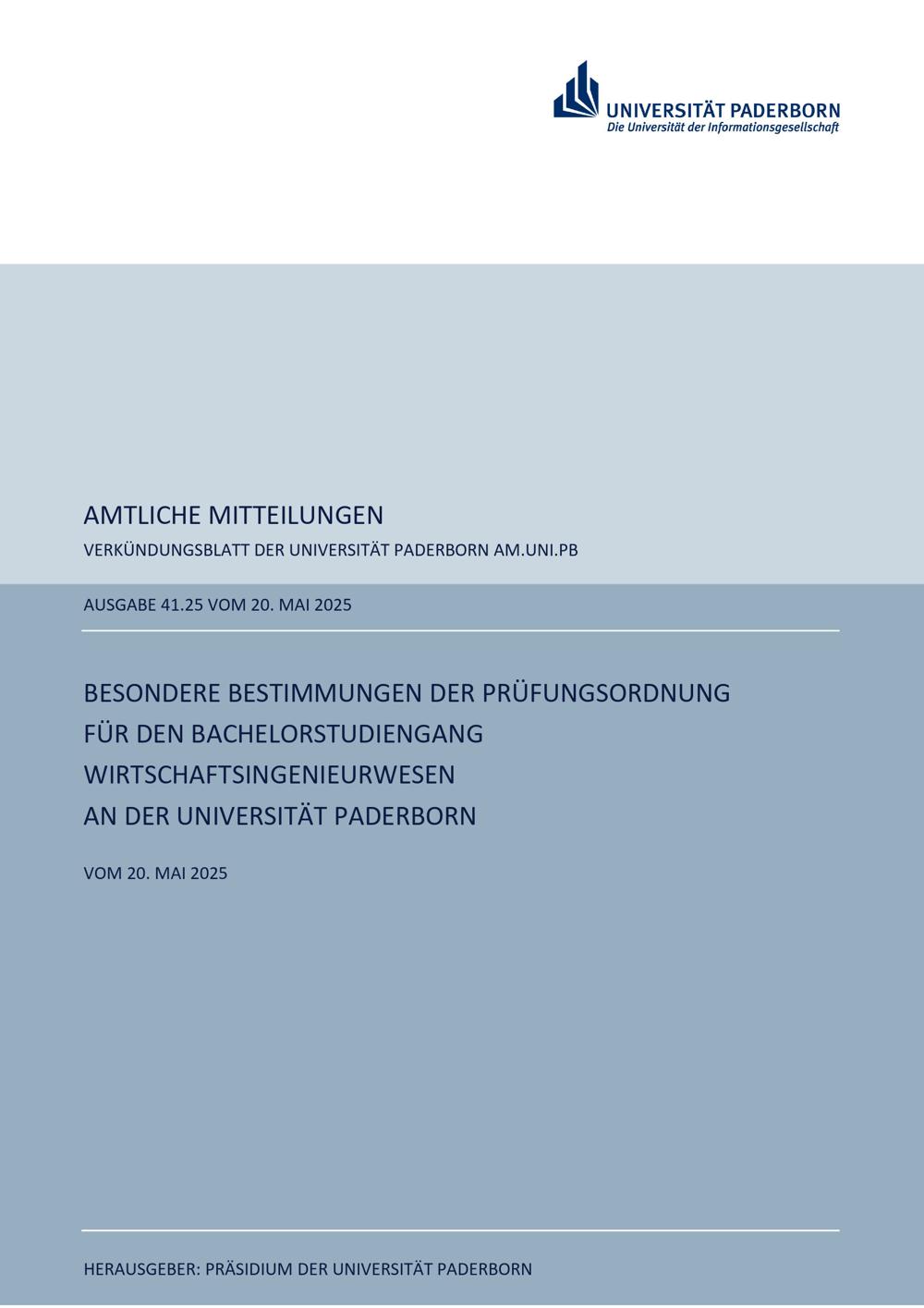Besondere Bestimmungen der Prüfungsordnung für den Bachelorstudiengang Wirtschaftsingenieurwesen an der Universität Paderborn : vom 20. Mai 2025