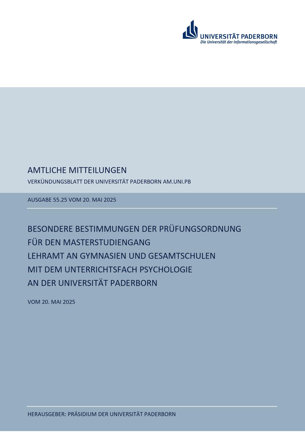 Besondere Bestimmungen der Prüfungsordnung für den Masterstudiengang Lehramt an Gymnasien und Gesamtschulen mit dem Unterrichtsfach Psychologie an der Universität Paderborn : vom 20. Mai 2025
