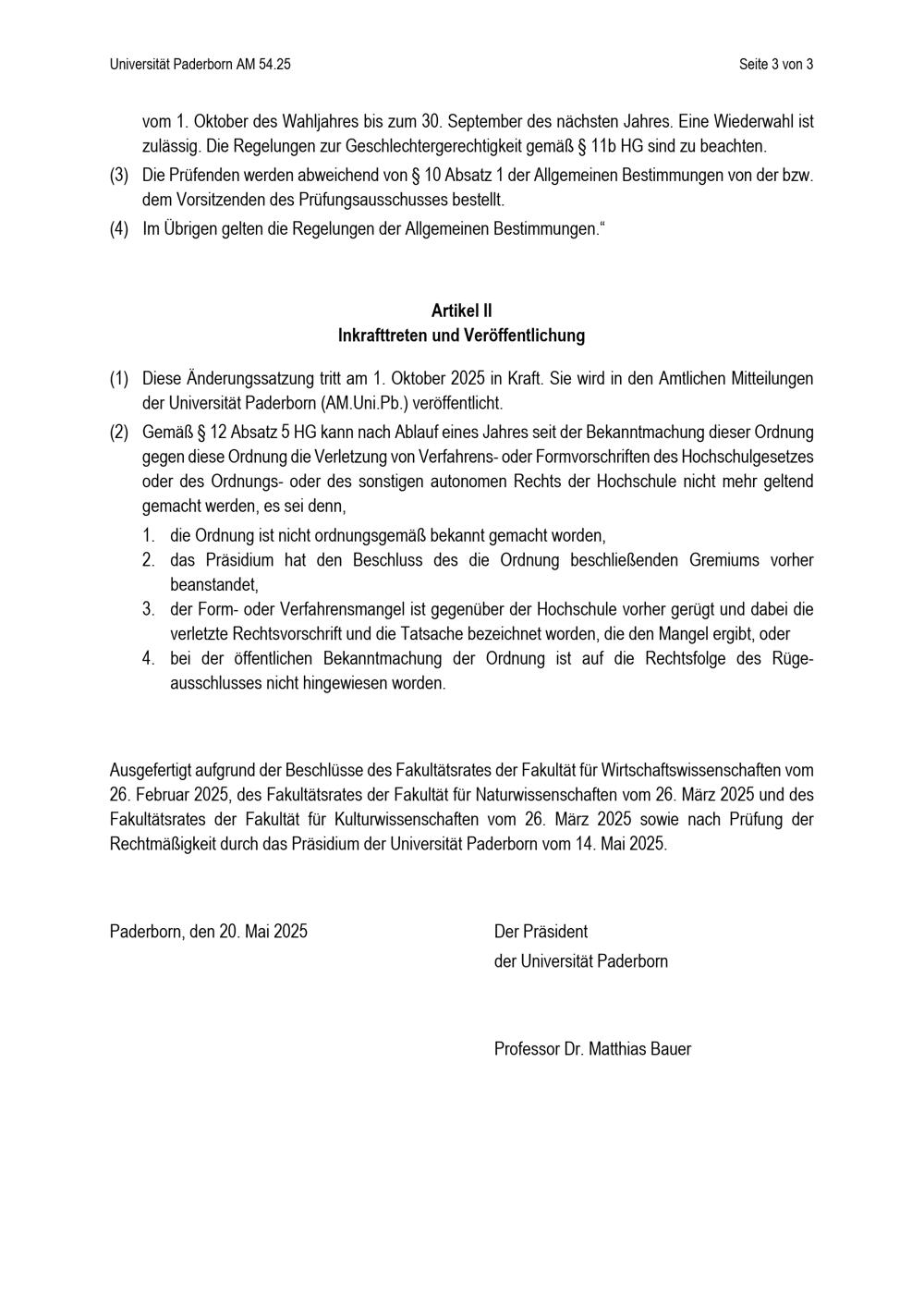 Zweite Satzung zur Änderung der Besonderen Bestimmungen der Prüfungsordnung für den Bachelorstudiengang Sportökonomie an der Universität Paderborn : vom 20. Mai 2025
