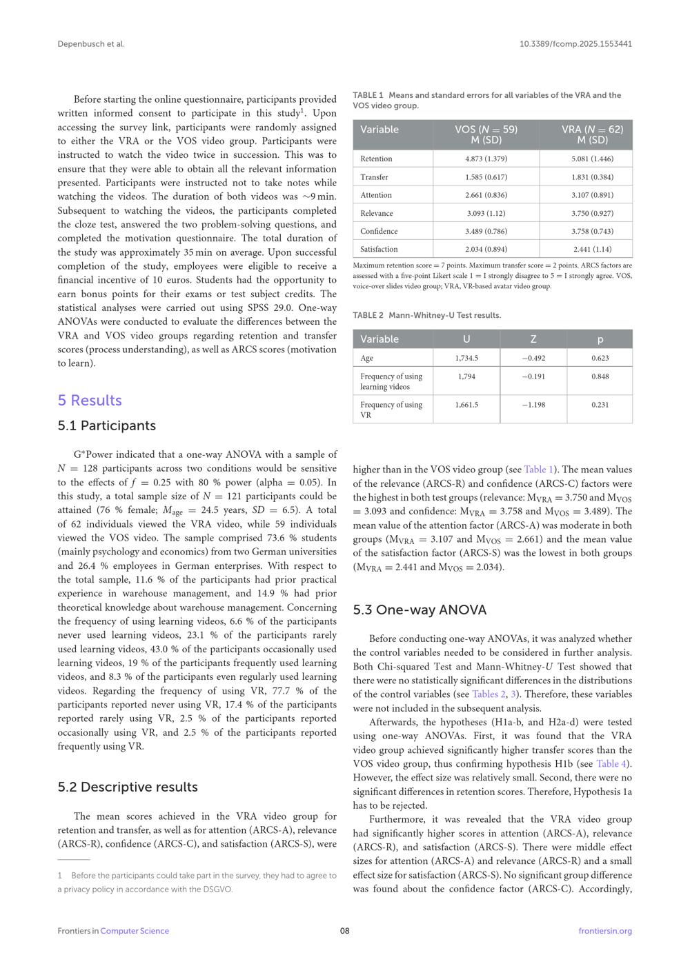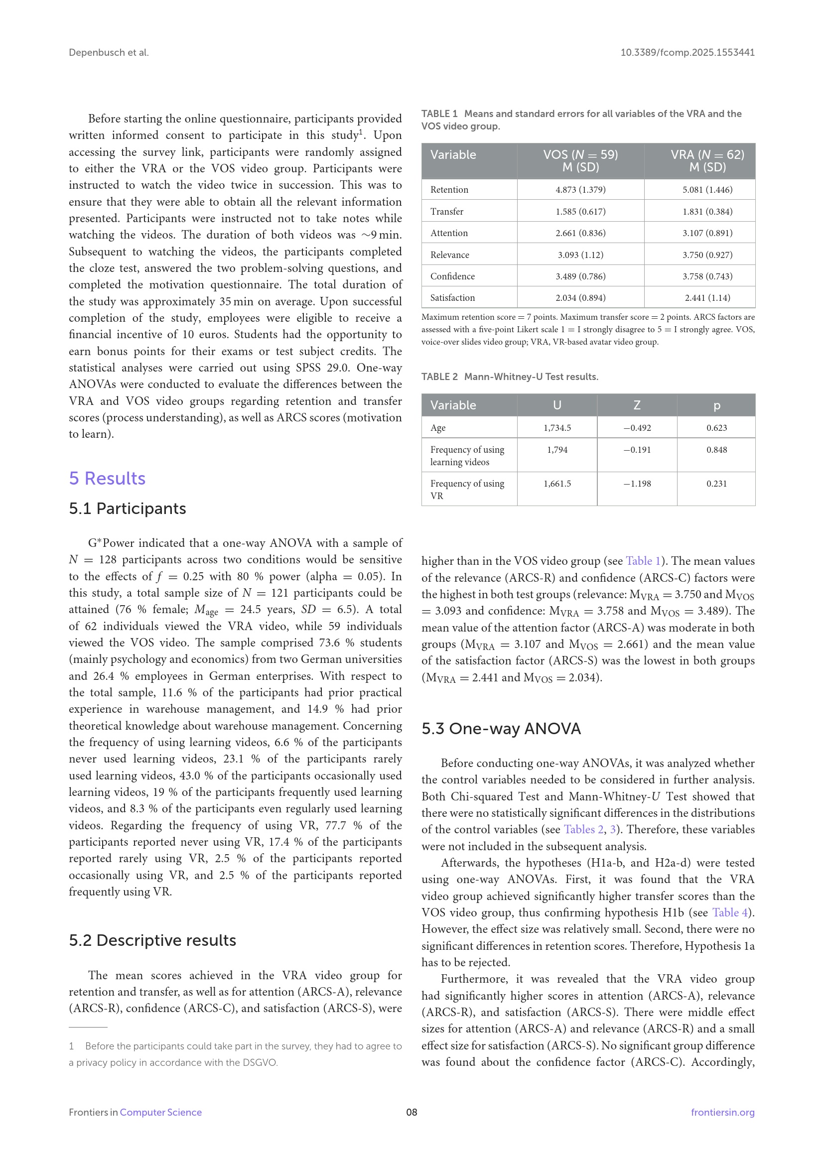 6.2 The effects of the VRA and VOS videos on motivation to learn