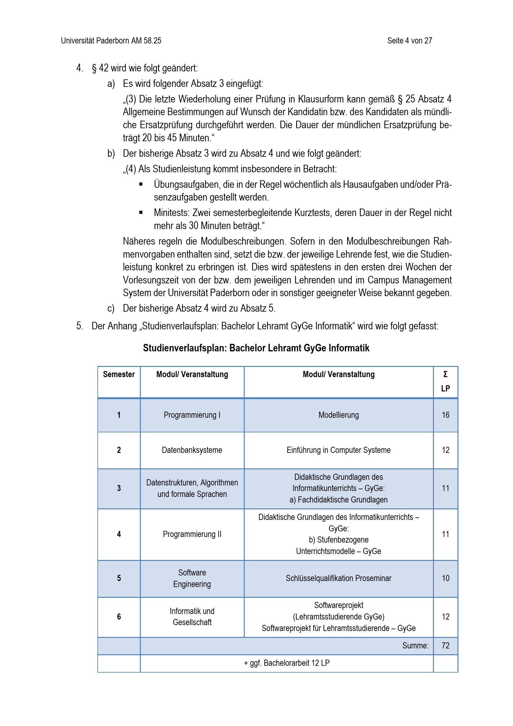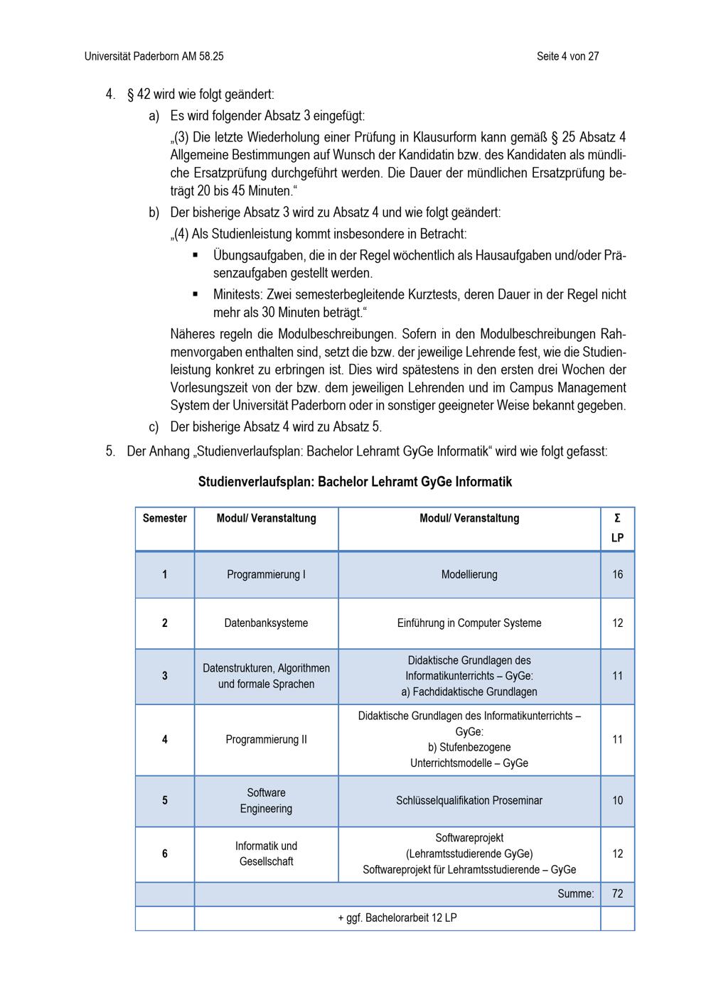 Satzung zur Änderung der Besonderen Bestimmungen der Prüfungsordnung für den Bachelorstudiengang Lehramt an Gymnasien und Gesamtschulen mit dem Unterrichtsfach Informatik an der Universität Paderborn : vom 4. Juli 2025