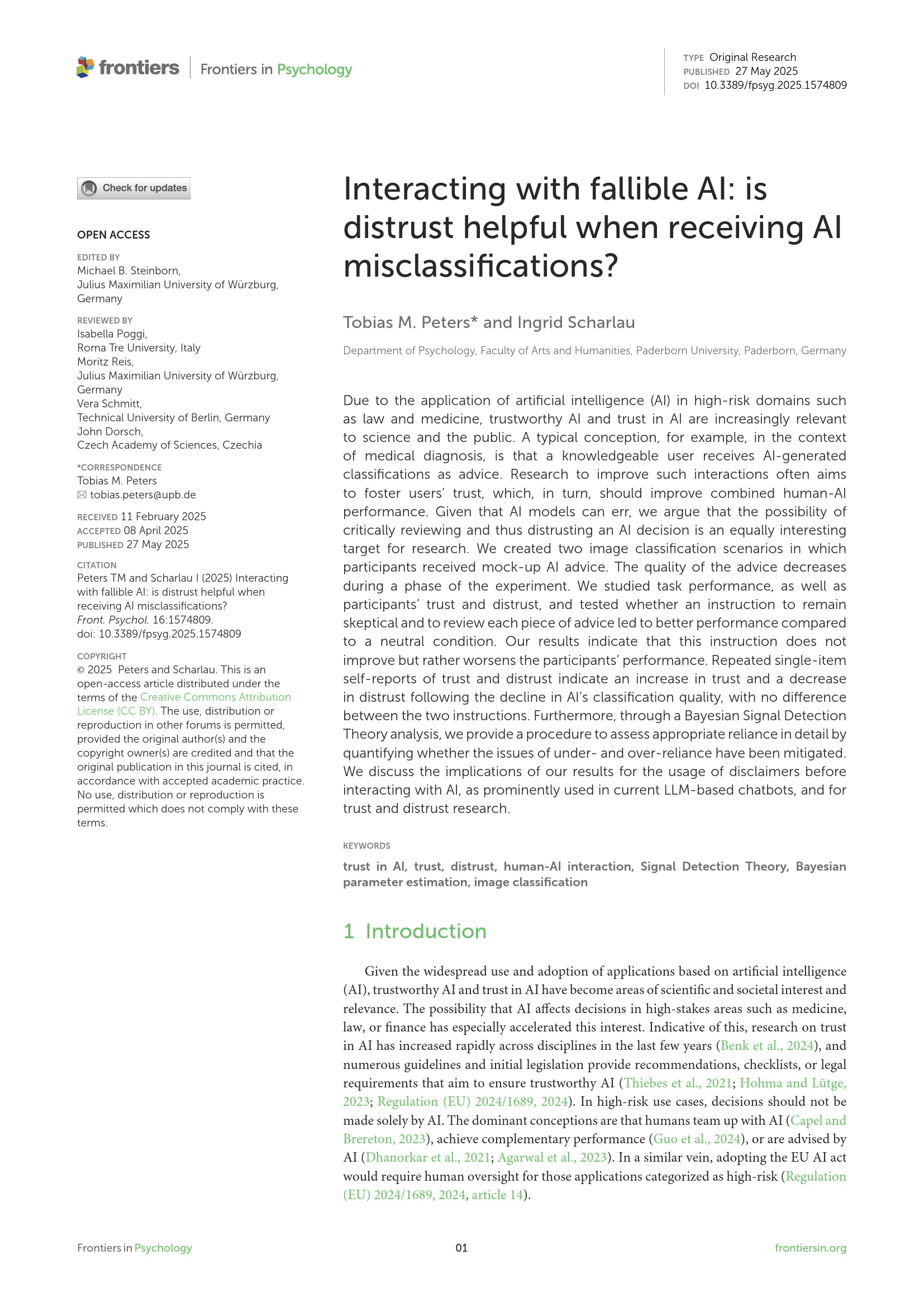 Interacting with fallible AI : is distrust helpful when receiving AI misclassifications? / Tobias M. Peters and Ingrid Scharlau