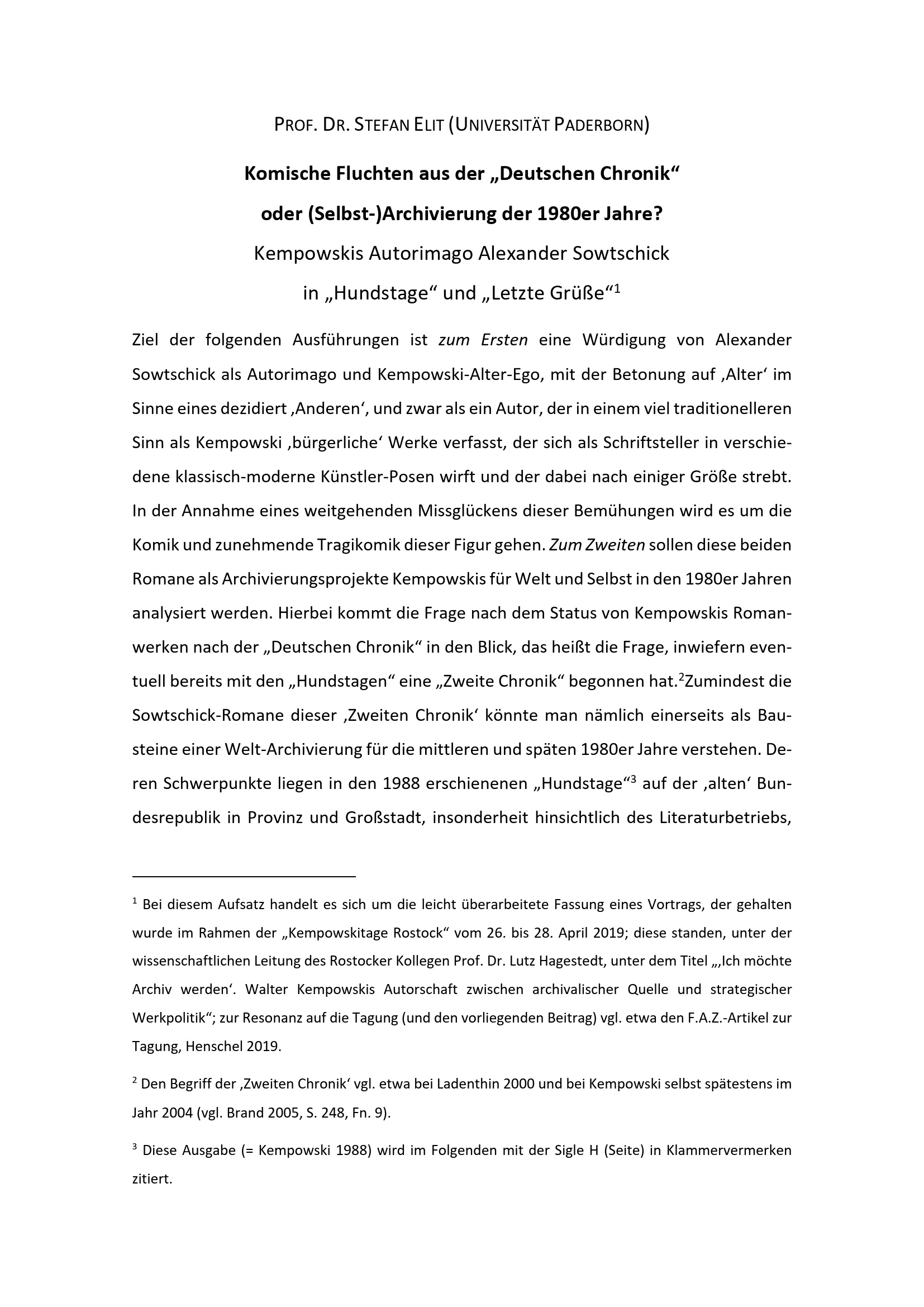 Komische Fluchten aus der „Deutschen Chronik“ oder (Selbst-)Archivierung der 1980er Jahre? : Kempowskis Autorimago Alexander Sowtschick in „Hundstage“ und „Letzte Grüße“ / Prof. Dr. Stefan Elit (Universität Paderborn)