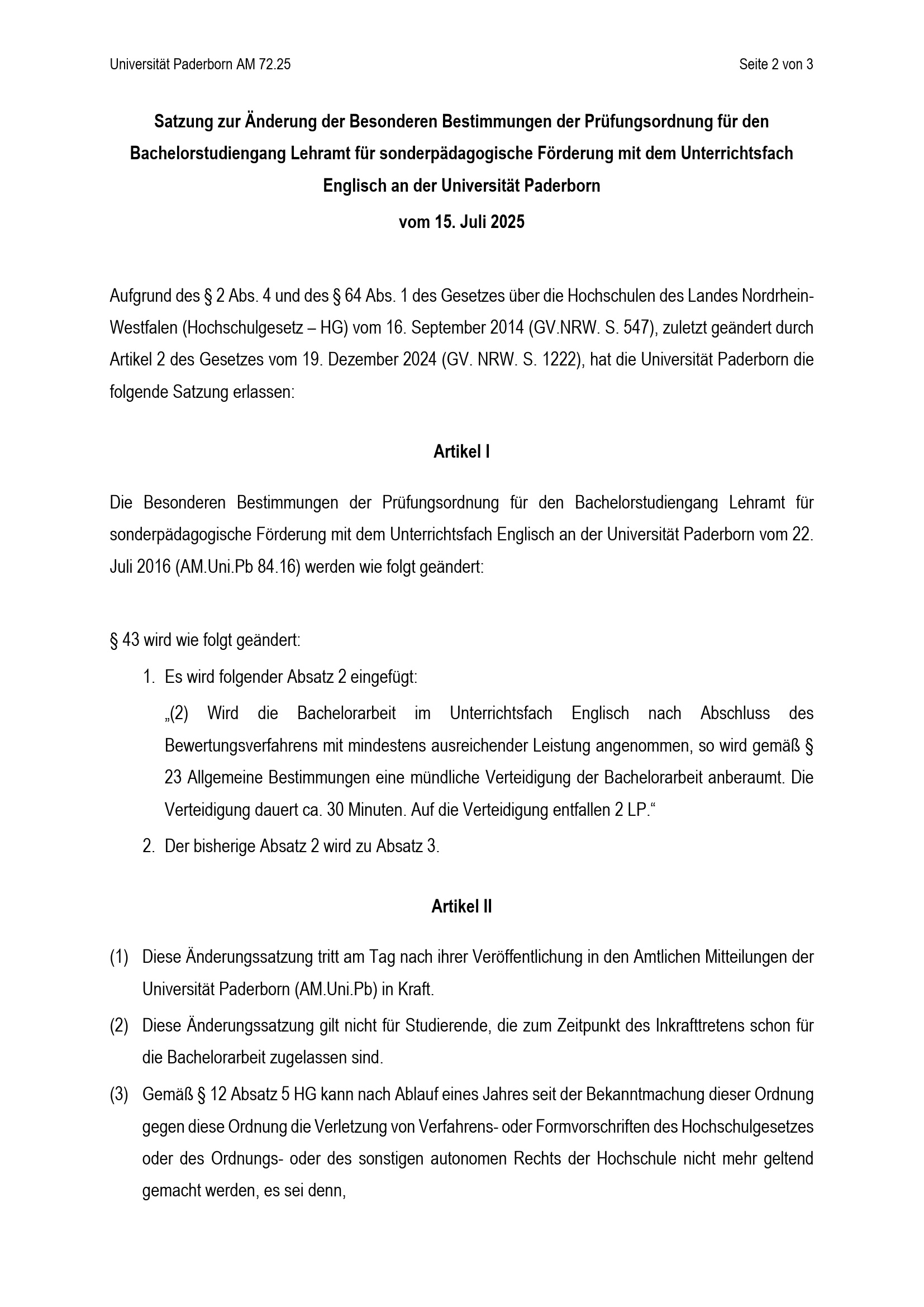 Satzung zur Änderung der Besonderen Bestimmungen der Prüfungsordnung für den Bachelorstudiengang Lehramt für sonderpädagogische Förderung mit dem Unterrichtsfach Englisch an der Universität Paderborn : vom 15. Juli 2025