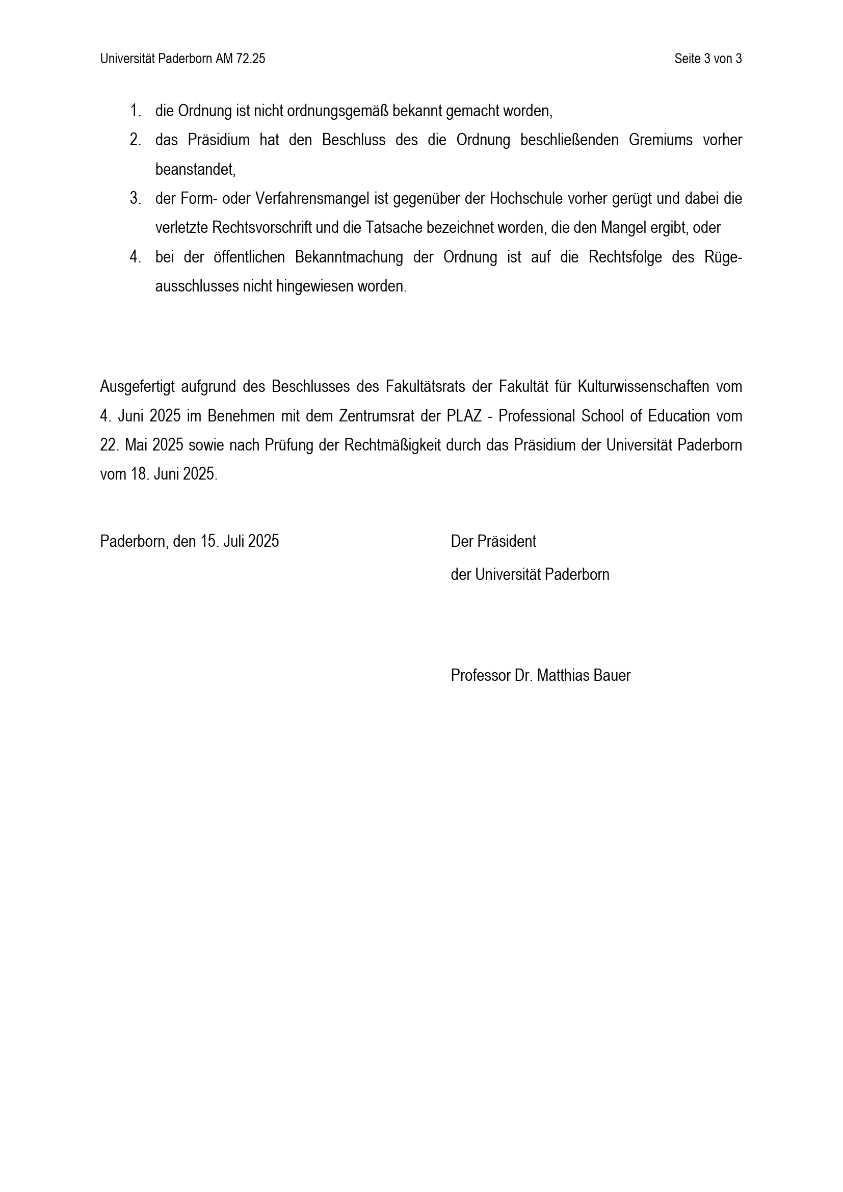 Satzung zur Änderung der Besonderen Bestimmungen der Prüfungsordnung für den Bachelorstudiengang Lehramt für sonderpädagogische Förderung mit dem Unterrichtsfach Englisch an der Universität Paderborn : vom 15. Juli 2025
