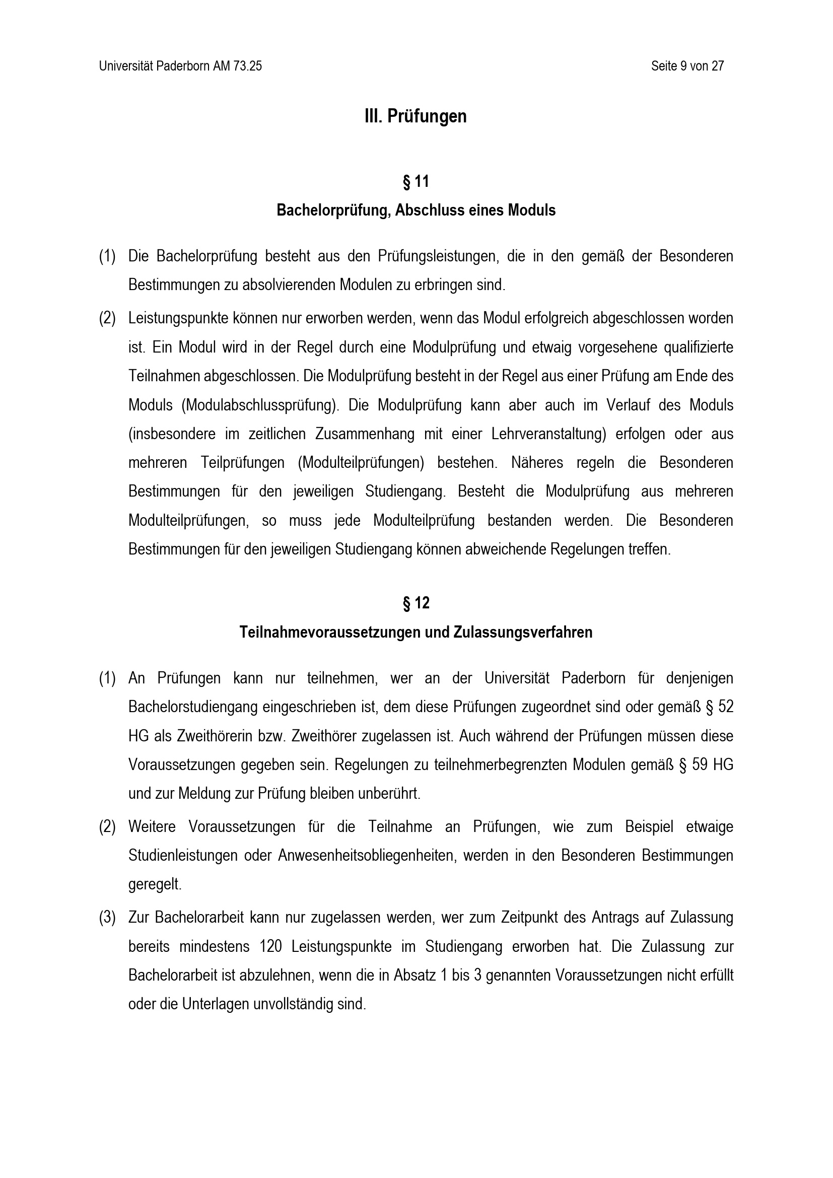 Allgemeine Bestimmungen der Prüfungsordnungen für die Bachelorstudiengänge der Fakultät für Kulturwissenschaften mit Ausnahme des Zwei-Fach-Bachelor-Studiengangs der Universität Paderborn : vom 15: Juli 2025