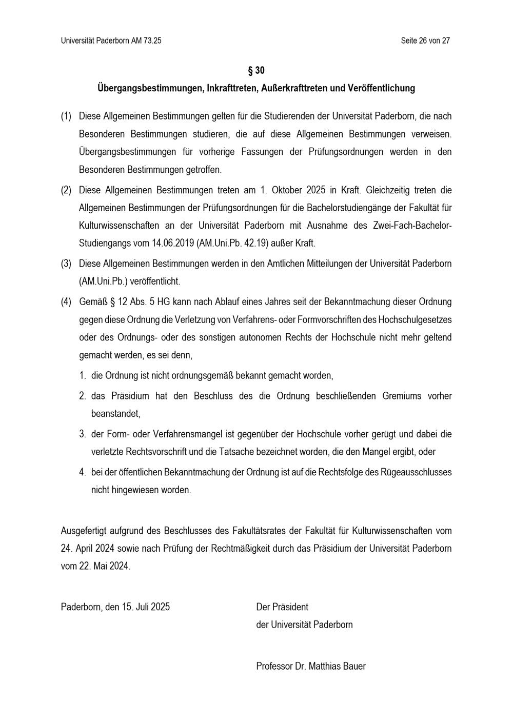 Allgemeine Bestimmungen der Prüfungsordnungen für die Bachelorstudiengänge der Fakultät für Kulturwissenschaften mit Ausnahme des Zwei-Fach-Bachelor-Studiengangs der Universität Paderborn : vom 15: Juli 2025