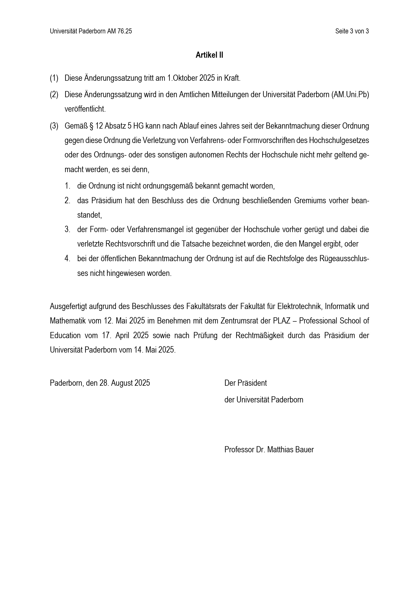 Satzung zur Änderung der Besonderen Bestimmungen der Prüfungsordnung für den Masterstudiengang Lehramt an Berufskollegs mit der Großen beruflichen Fachrichtung Elektrotechnik an der Universität Paderborn : vom 28. August 2025