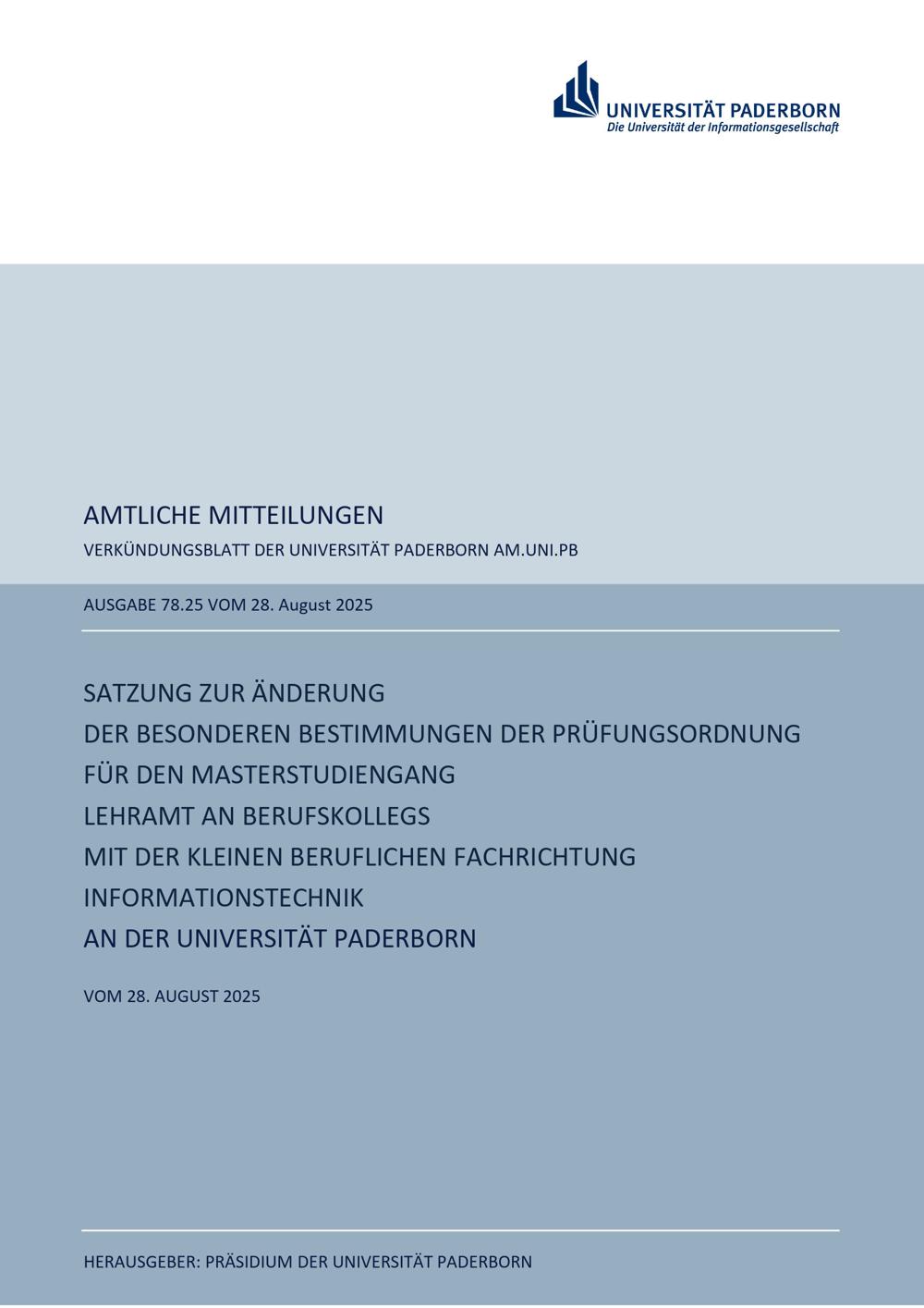Satzung zur Änderung der Besonderen Bestimmungen der Prüfungsordnung für den Masterstudiengang Lehramt an Berufskollegs mit der Kleinen beruflichen Fachrichtung Informationstechnik an der Universität Paderborn : vom 28. August 2025