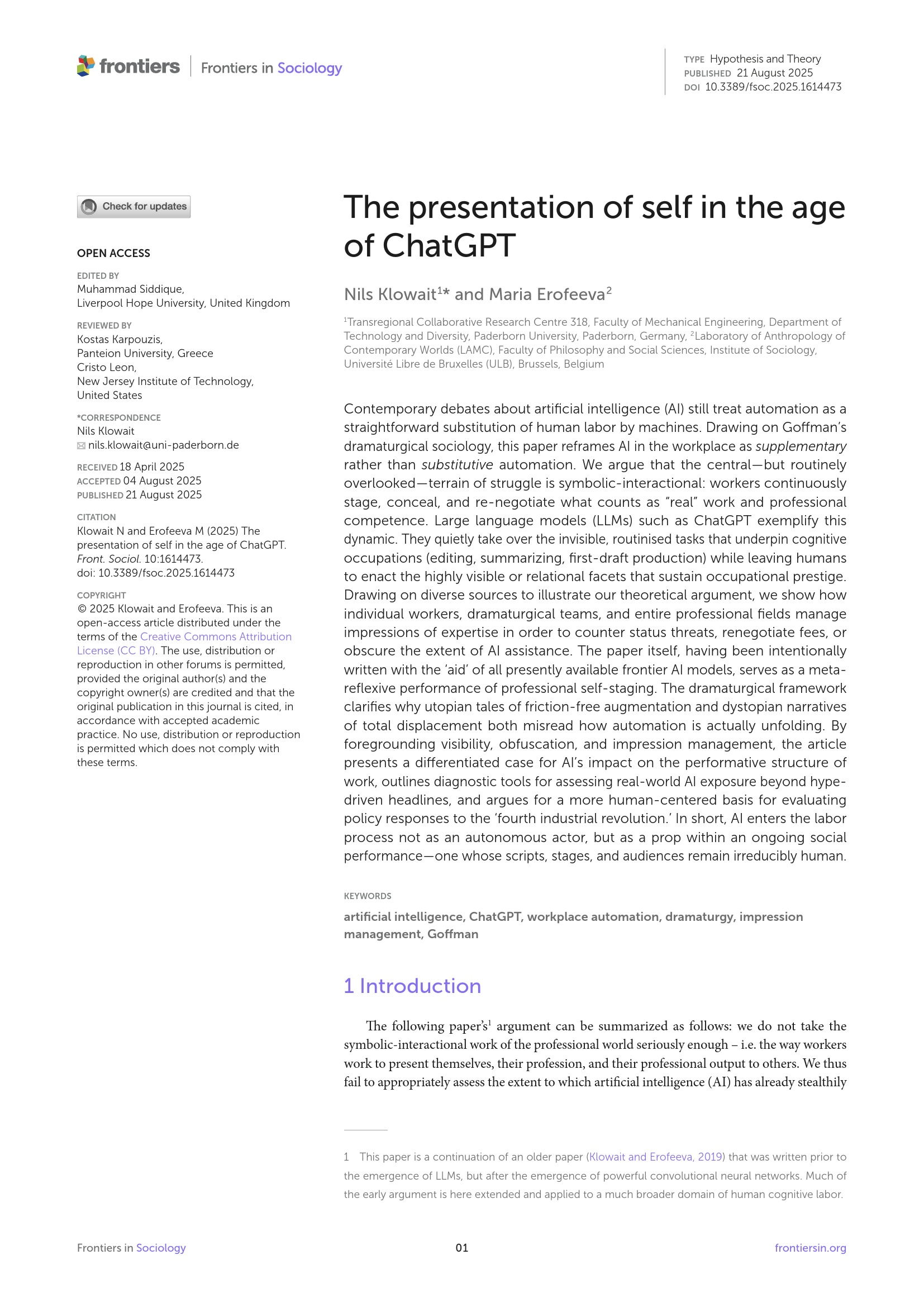 The presentation of self in the age of ChatGPT / Nils Klowait and Maria Erofeeva