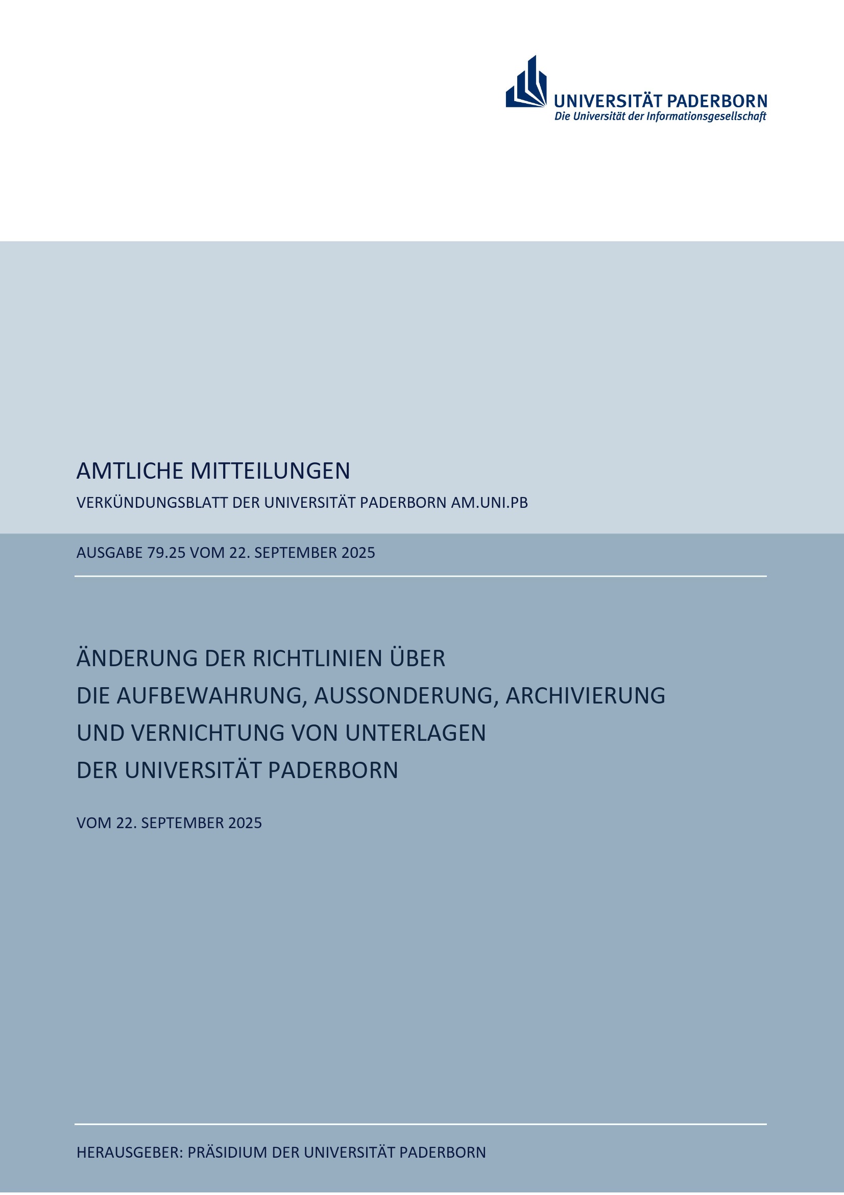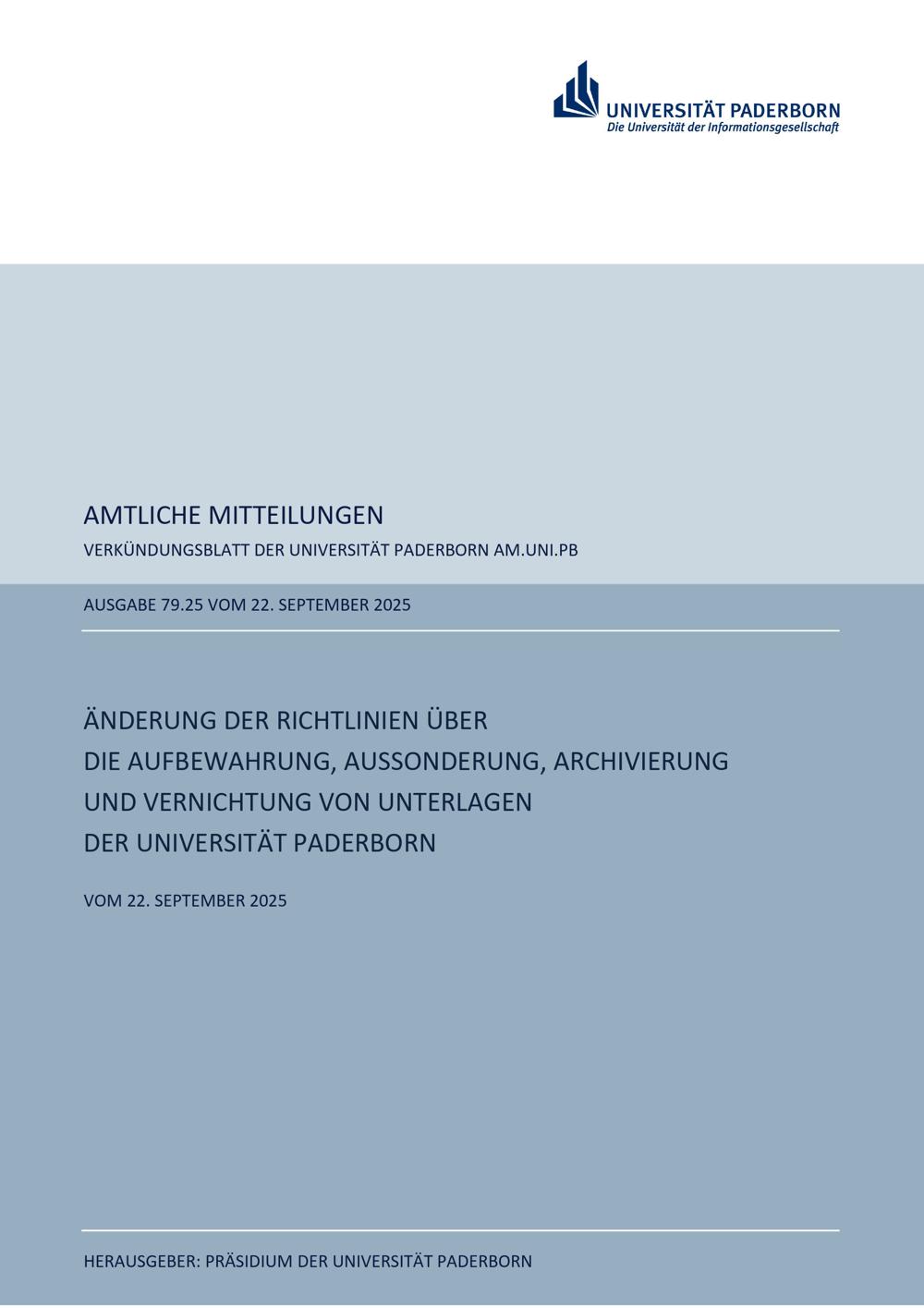 Änderung der Richtlinien über die Aufbewahrung, Aussonderung, Archivierung und Vernichtung von Unterlagen der Universität Paderborn : vom 22. September 2025