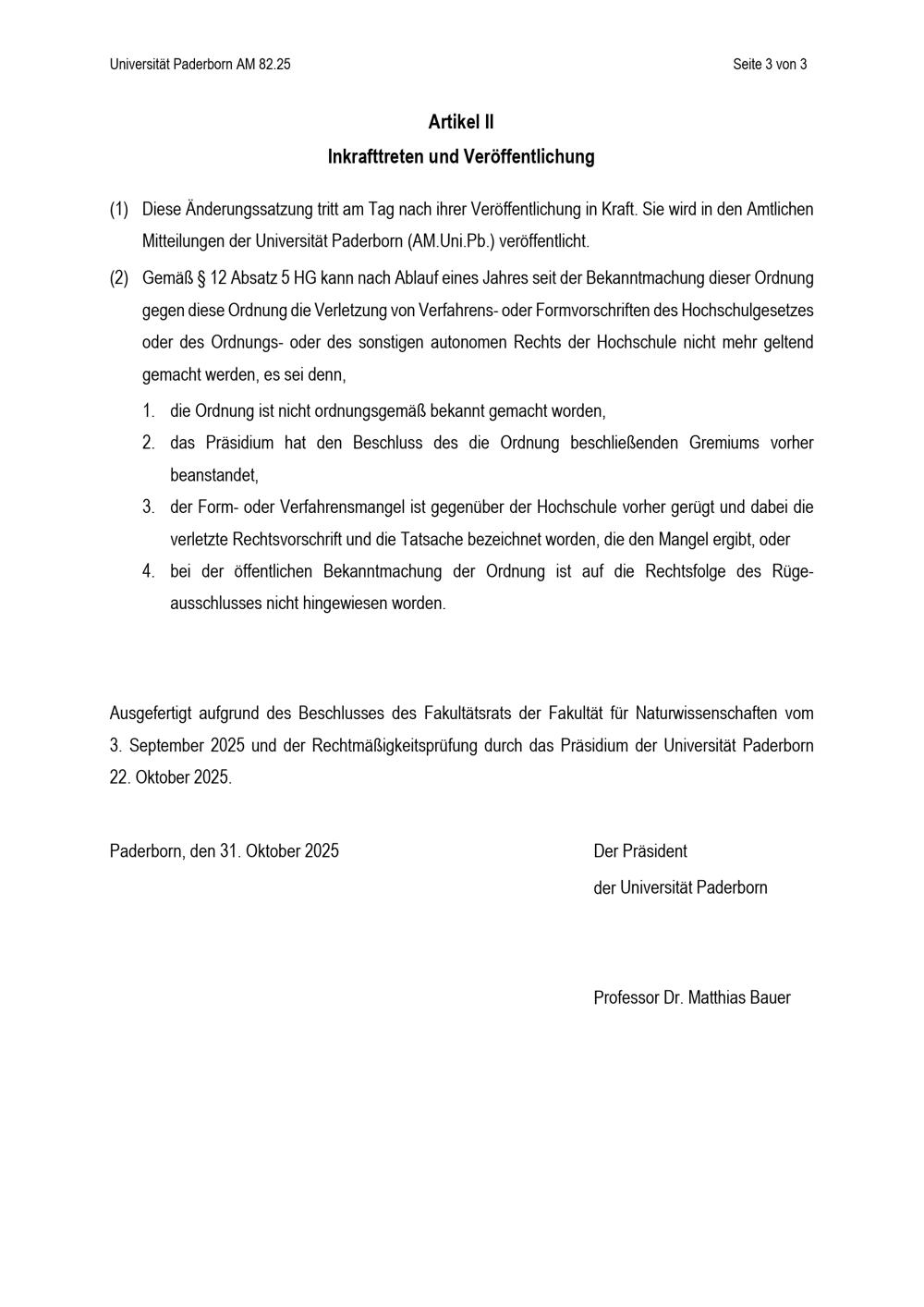 Satzung zur Änderung der Besonderen Bestimmungen der Prüfungsordnung für den Masterstudiengang Materials Science der Fakultät für Naturwissenschaften an der Universität Paderborn : vom 31. Oktober 2025
