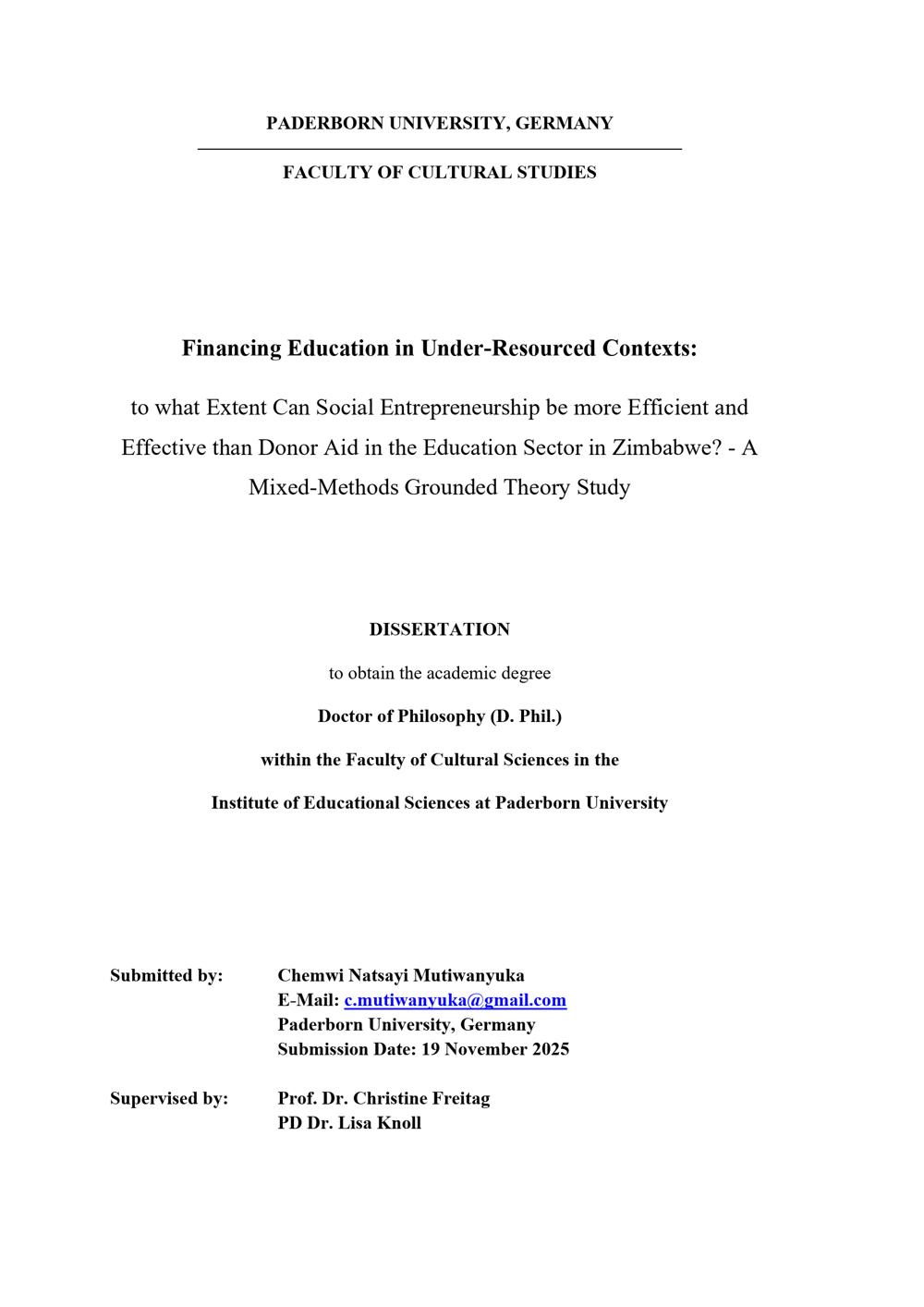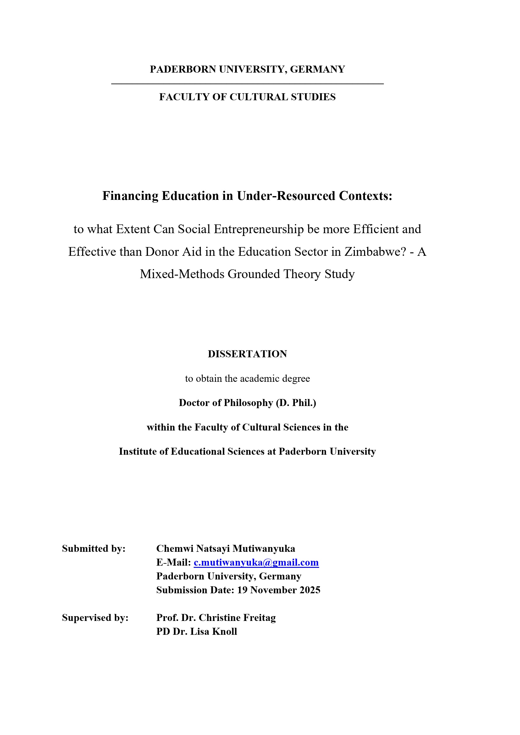 Financing education in under-resourced contexts : To what extent can social entrepreneurship be more efficient and effective than donor aid in the education sector in Zimbabwe? - a mixed-methods grounded theory study / Chemwi Matsayi Mutiwanyuka ; supervised by: Prof. Dr. Christine Freitag, PD Dr. Lisa Knoll
