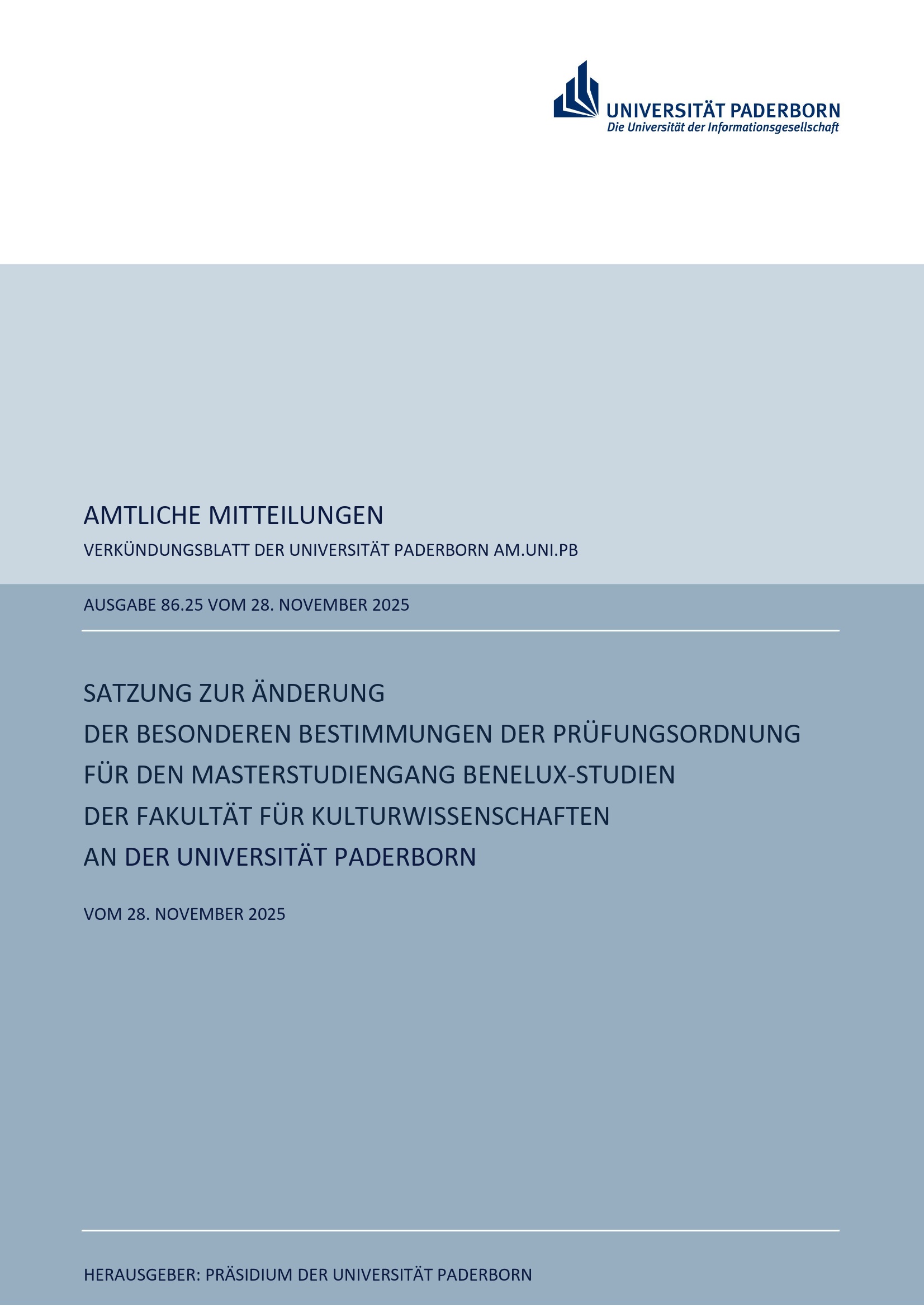 Satzung zur Änderung der Besonderen Bestimmungen der Prüfungsordnung für den Masterstudiengang „BeNeLux-Studien“ der Fakultät für Kulturwissenschaften an der Universität Paderborn : vom 28. November 2025