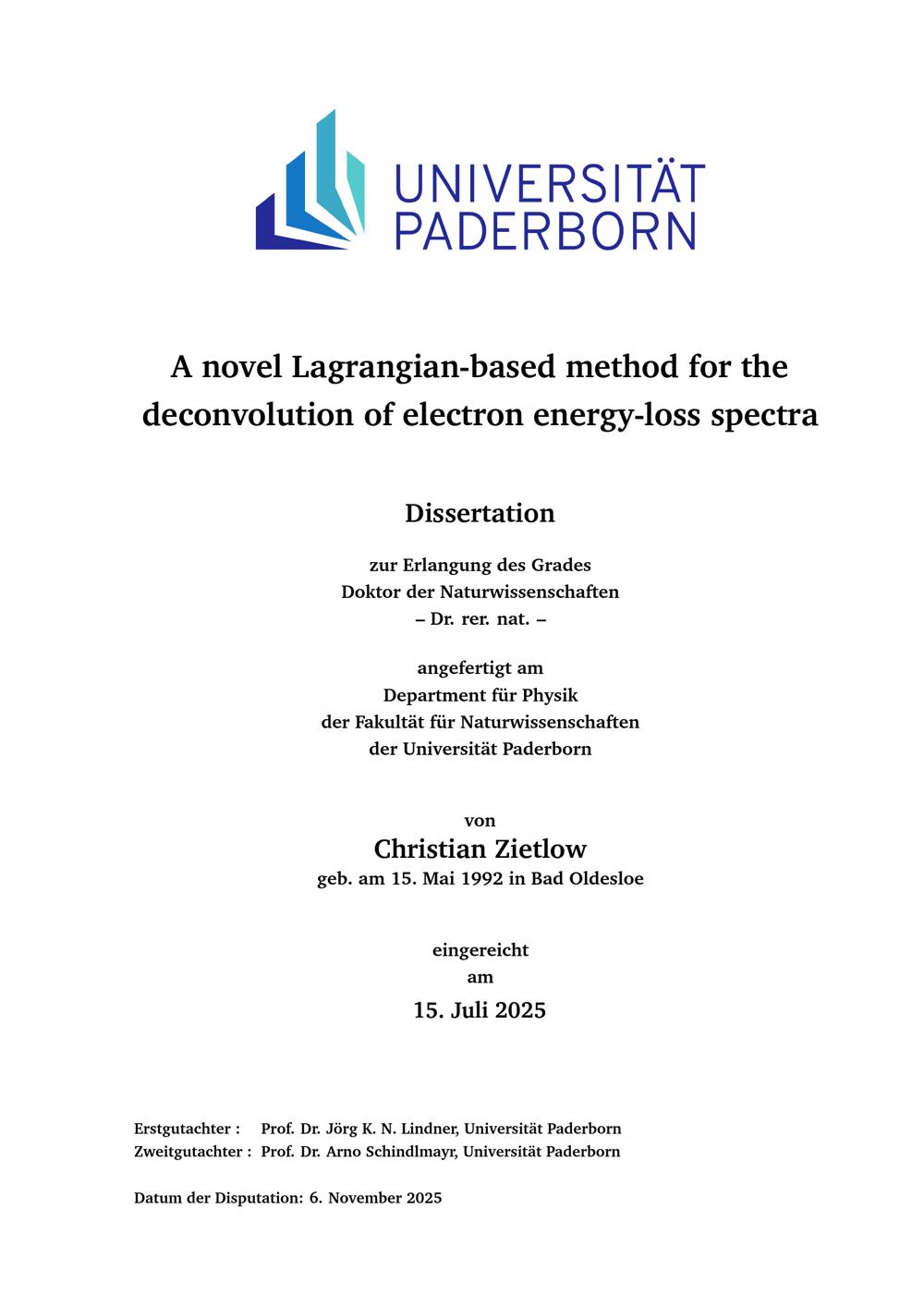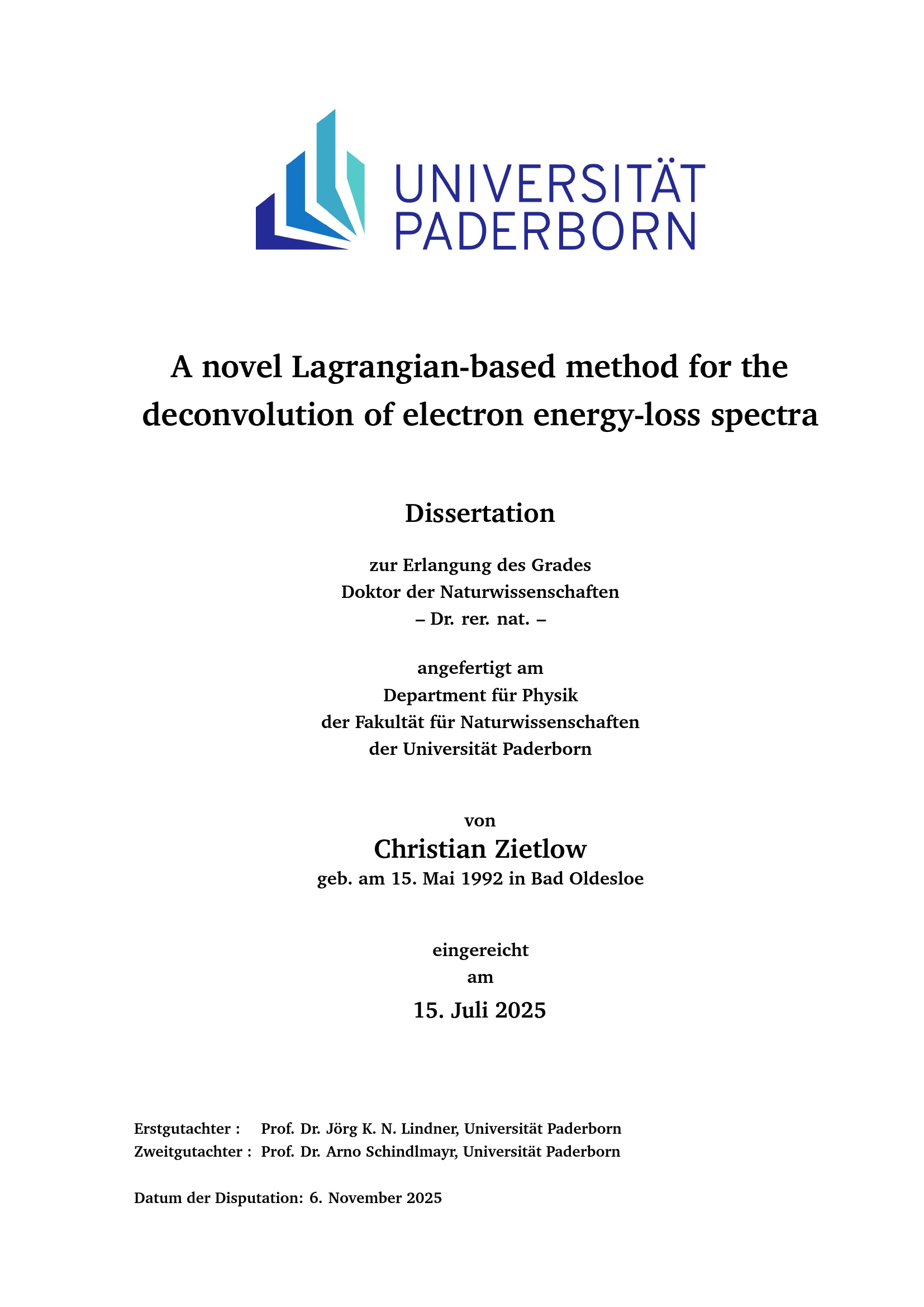 A novel Lagrangian-based method for the deconvolution of electron energy-loss spectra / von Christian Zietlow ; Erstgutachter : Prof. Dr. Jörg K. N. Lindner, Universität Paderborn, Zweitgutachter : Prof. Dr. Arno Schindlmayr, Universität Paderborn
