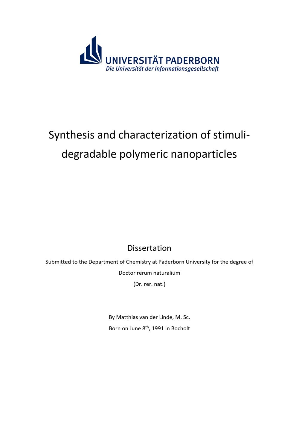 Synthesis and characterization of stimuli-degradable polymeric nanoparticles / by Matthias van der Linde ; Reviewer: Prof. Dr. Dirk Kuckling, Prof. Dr. Klaus Langer