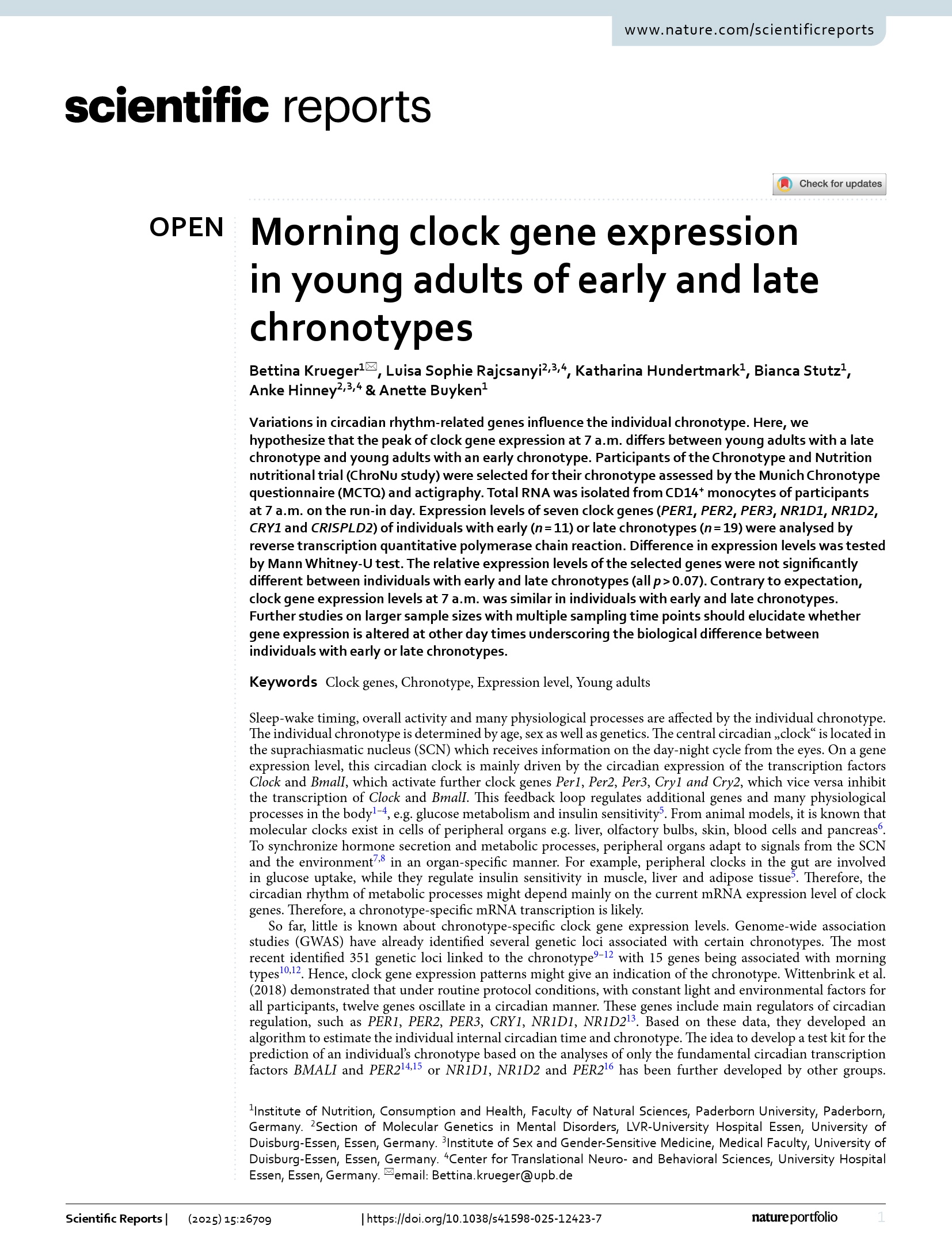 Morning clock gene expression in young adults of early and late chronotypes / Bettina Krueger, Luisa Sophie Rajcsanyi, Katharina Hundertmark, Bianca Stutz, Anke Hinney & Anette Buyken