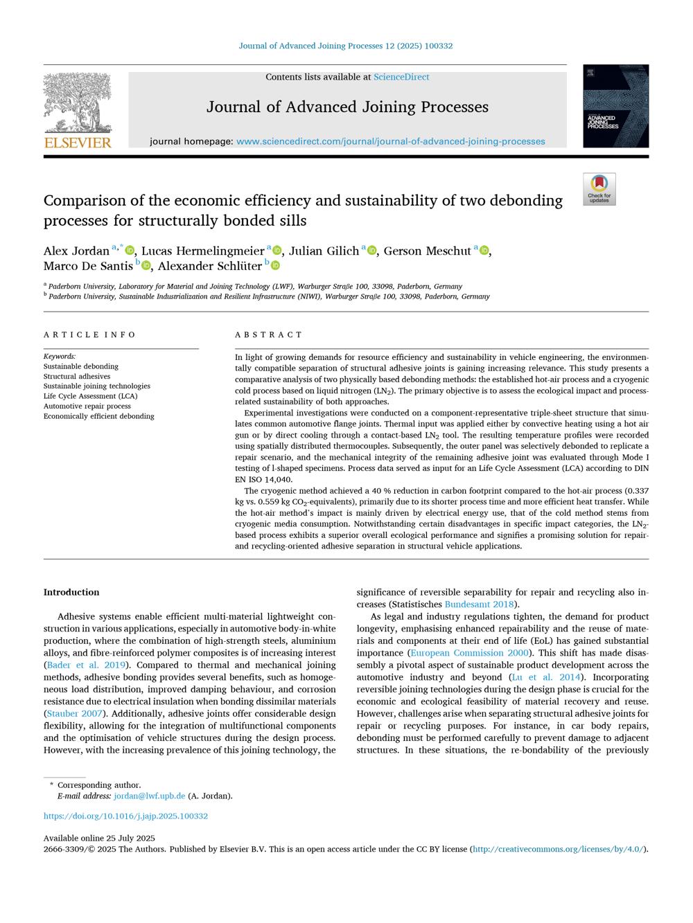 Comparison of the economic efficiency and sustainability of two debonding processes for structurally bonded sills / Alex Jordan, Lucas Hermelingmeier, Julian Gilich, Gerson Meschut, Marco De Santis, Alexander Schlüter