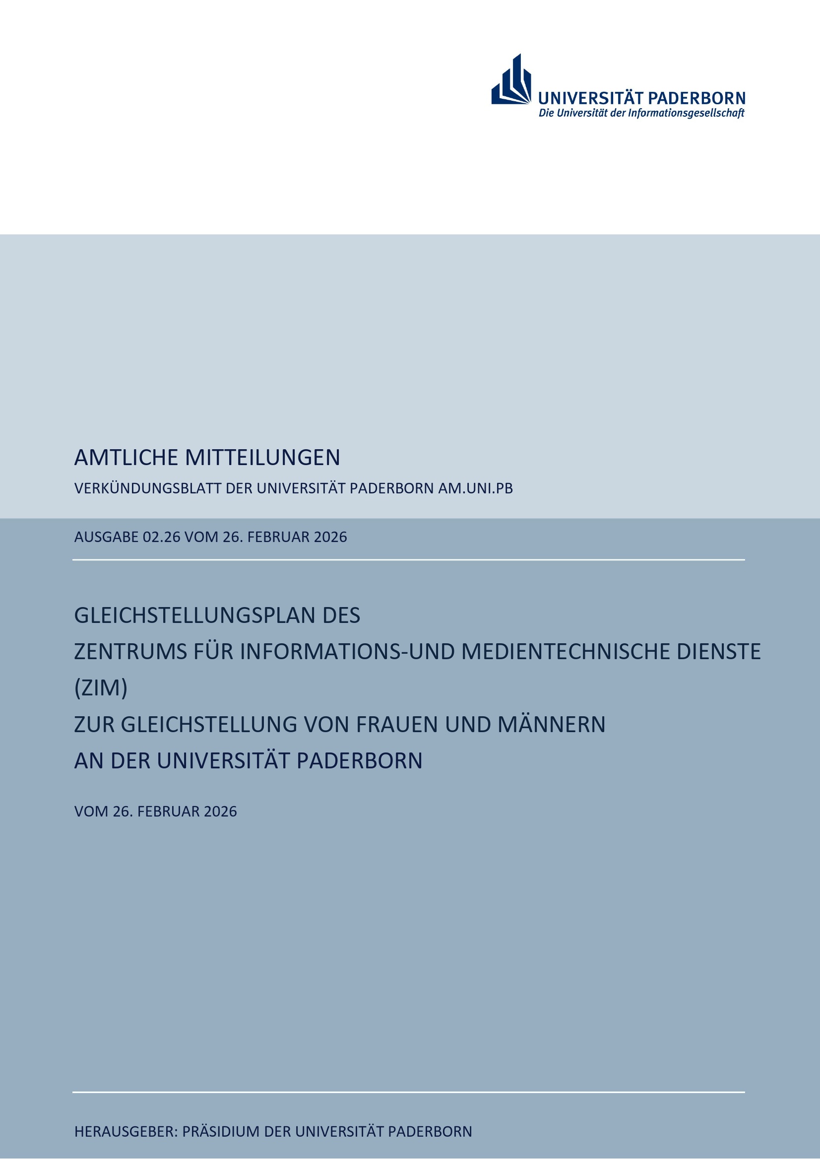 Gleichstellungsplan des Zentrums für Informations- und Medientechnische Dienste (ZIM) zur Gleichstellung von Frauen und Männern an der Universität Paderborn : vom 26. Februar 2026