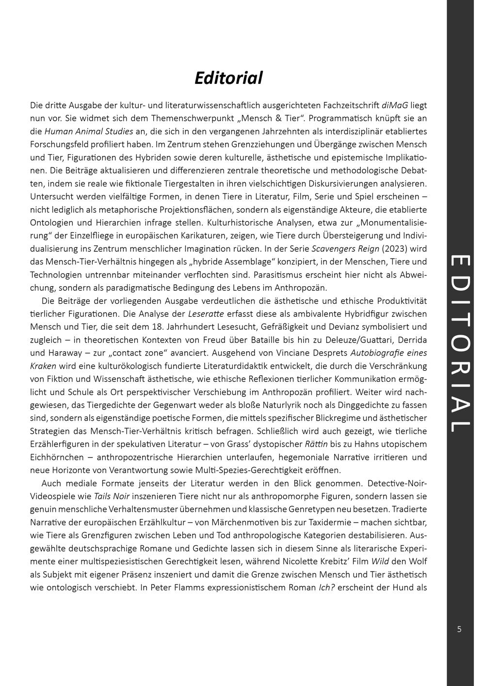 3 (2026) diMaG : Mensch & Tier / Herausgegeben von Prof. Dr. Anastasia Antonopoulou (Universität Athen / NKUA), Prof. Dr. Onur Kemal Bazarkaya (Marmara Universität Istanbul), Dr. Aqtime Gnouleleng Edjabou (Universität Kara), Anna Lewandowski M.A. (Universität Paderborn), Prof. Dr. Brahim Moussa (Universität Tunis), Dr. Swen Schulte Eickholt (Universität Paderborn), Dr. Cornelia Zierau (Universität Paderborn)